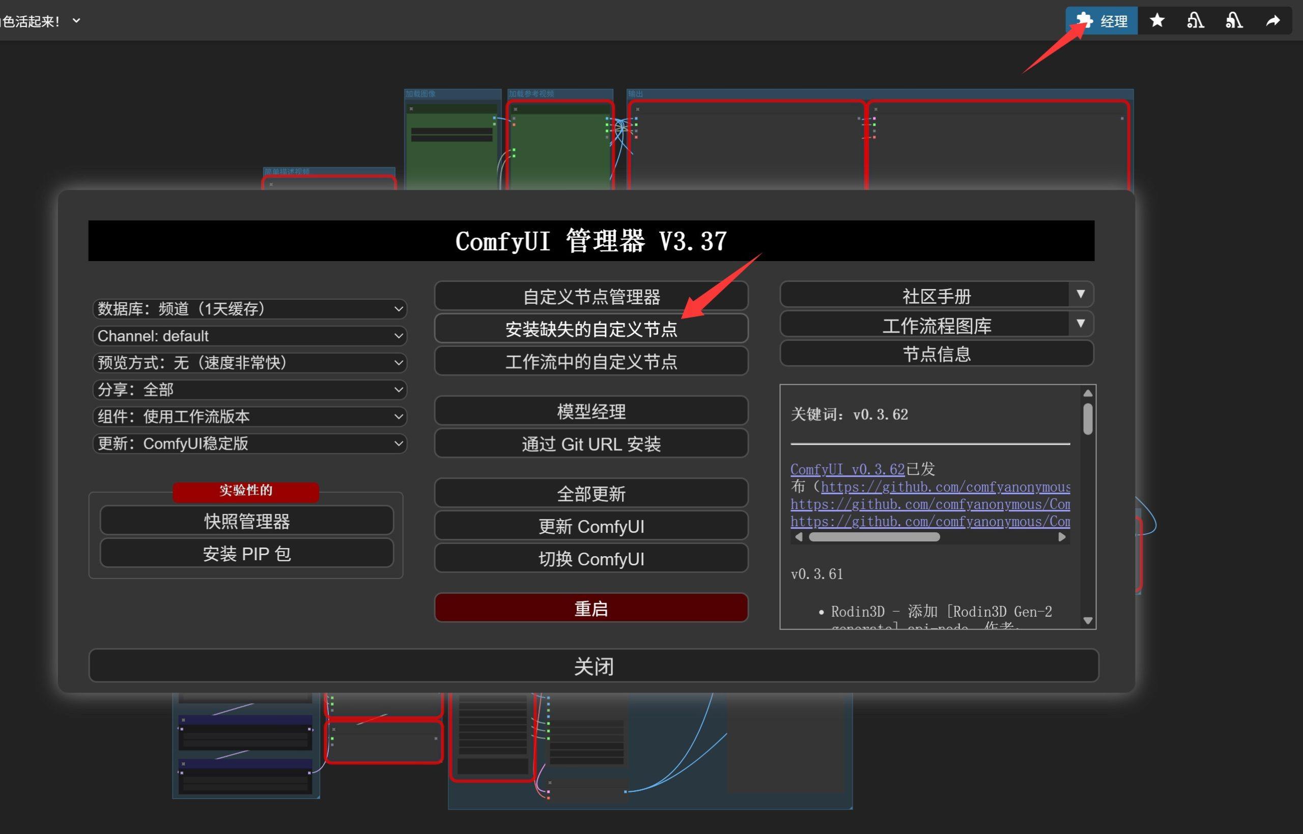 点击右上角的“Manager”按钮,打开节点管理器,准备一键安装所有插件。
