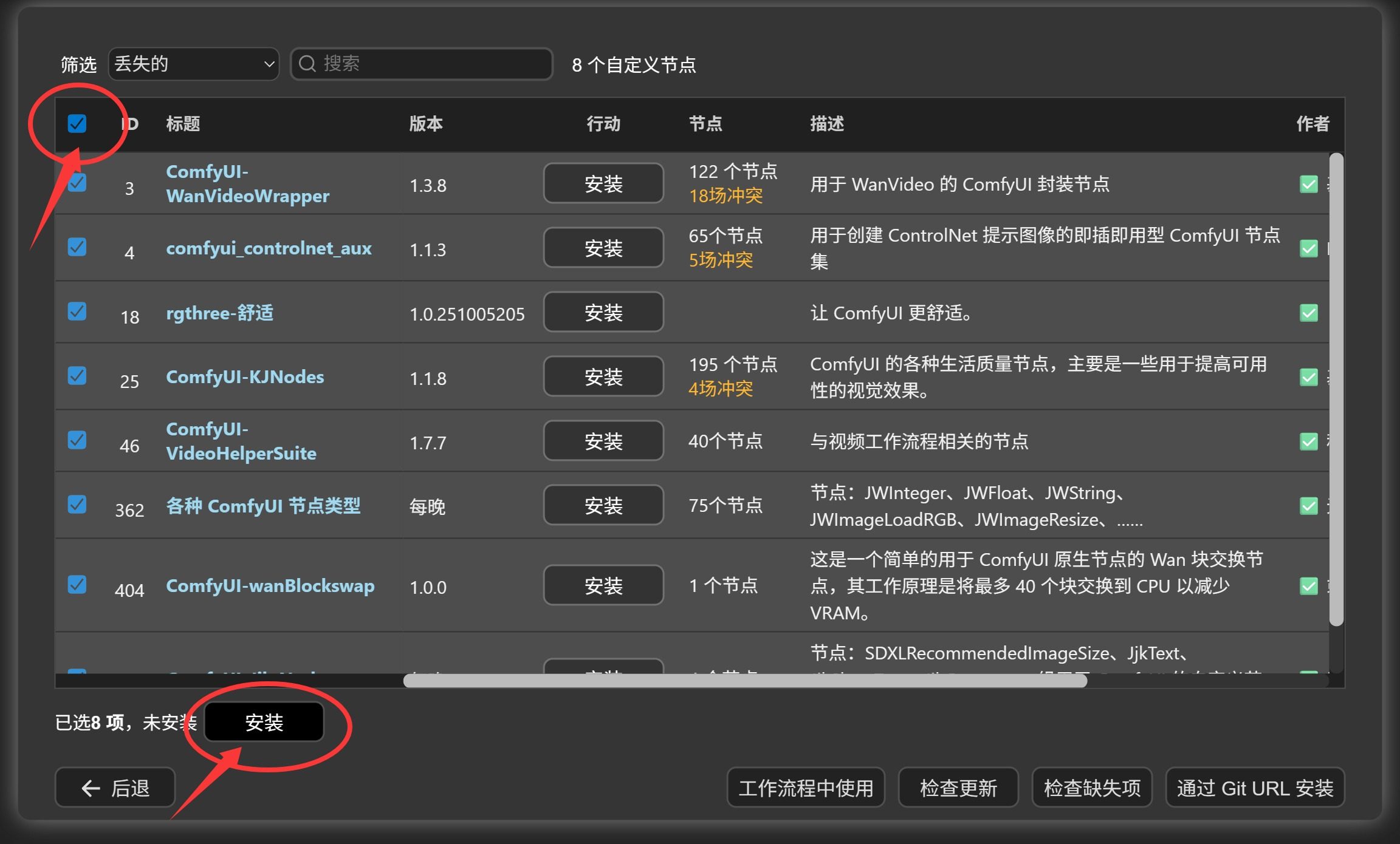 点击之后就会看到“自定义节点管理器”和“安装缺失的自定义节点”。这两个功能都可以快速安装节点,最方便的是第二个按钮,可以一次性列出所有缺失节点插件。