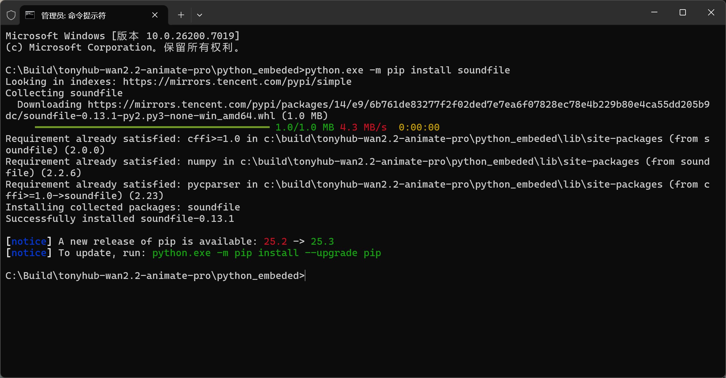 这里的 python.exe -m 是必写内容,不写就无法把依赖安装到我们特定的运行环境中。