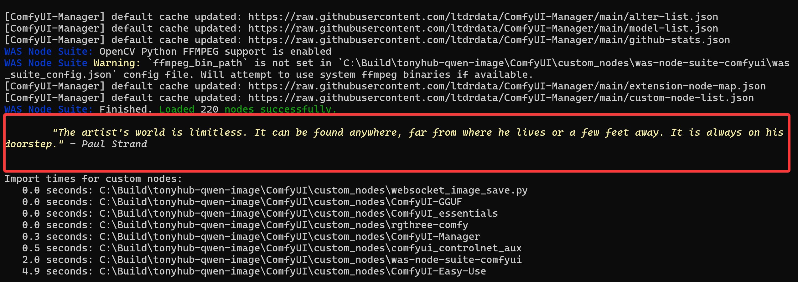 那么做个什么项目好呢? 最近在使用Qwen-Image的时候,发现了一个很有意思的点。每次启动comfyui之后 WAS节点都会在日志中打印一句名人名言。我觉得这个挺有意思的。