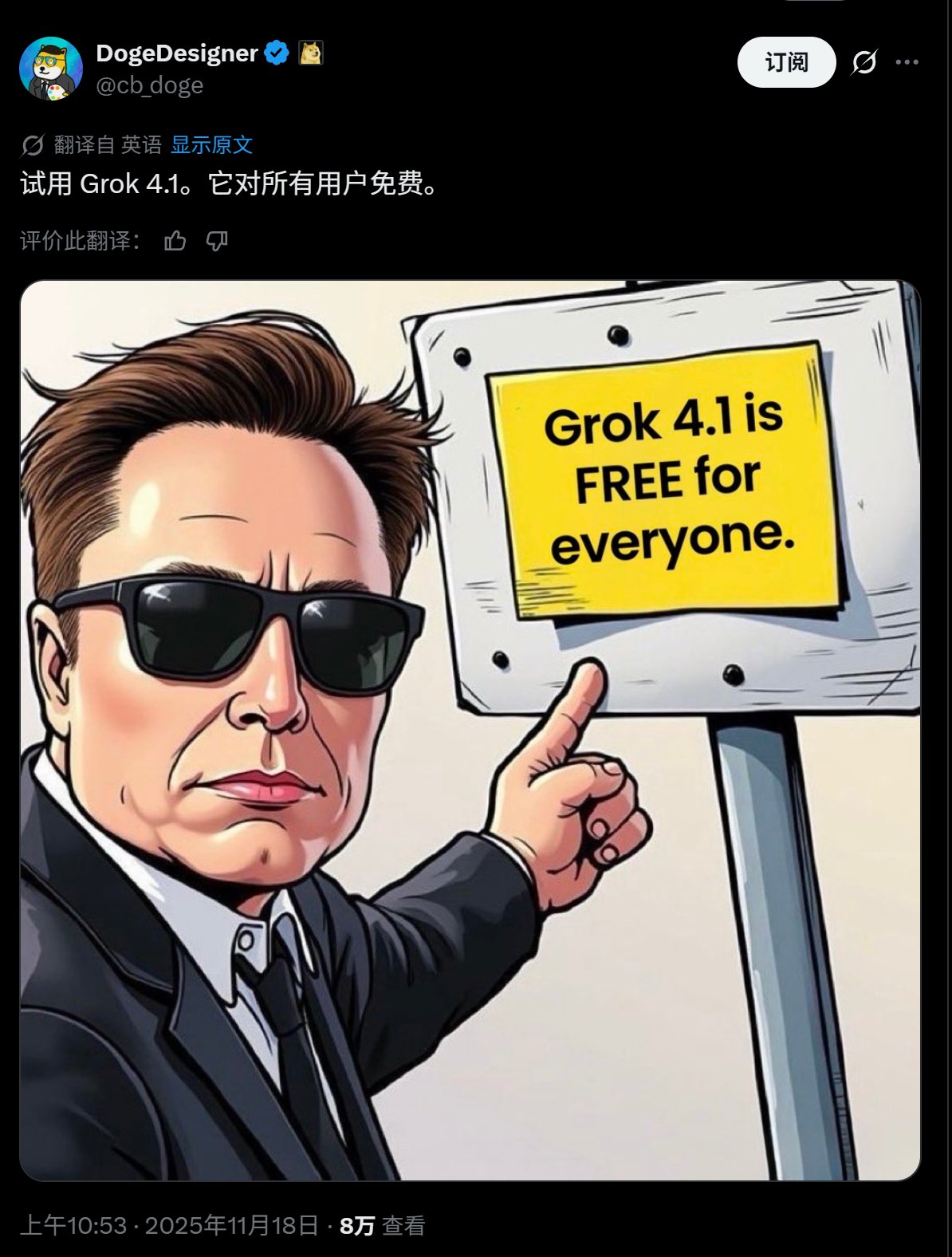 主要是强调免费,Grok-4.1所有人都可以免费使用。都说打蛇打七寸,众所周知GPT Plus 20,Pro 200。我也是ChatGPT的付费用户,每个月上供$20。