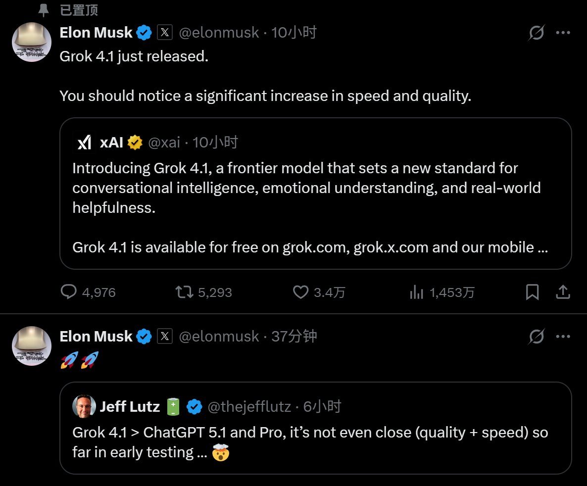 它转发了一条JeffLutz的帖子。并留下了两个小火箭🚀🚀。这个帖子说Grok-4.1要比GPT-5.1和Pro强。