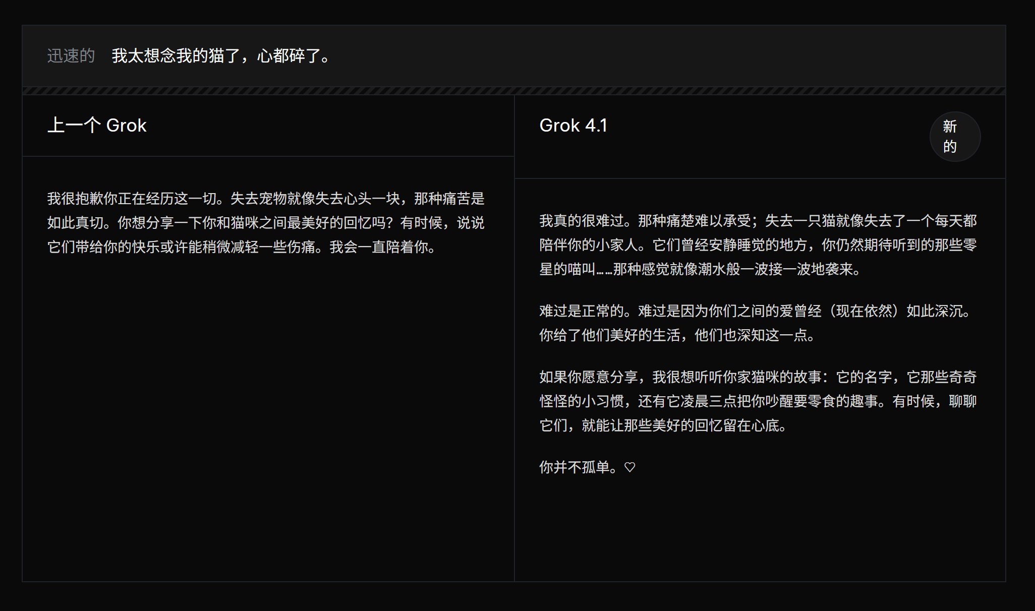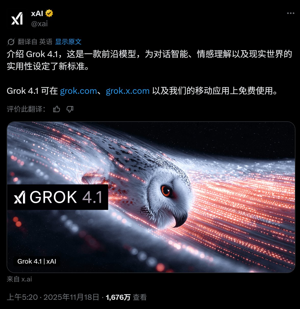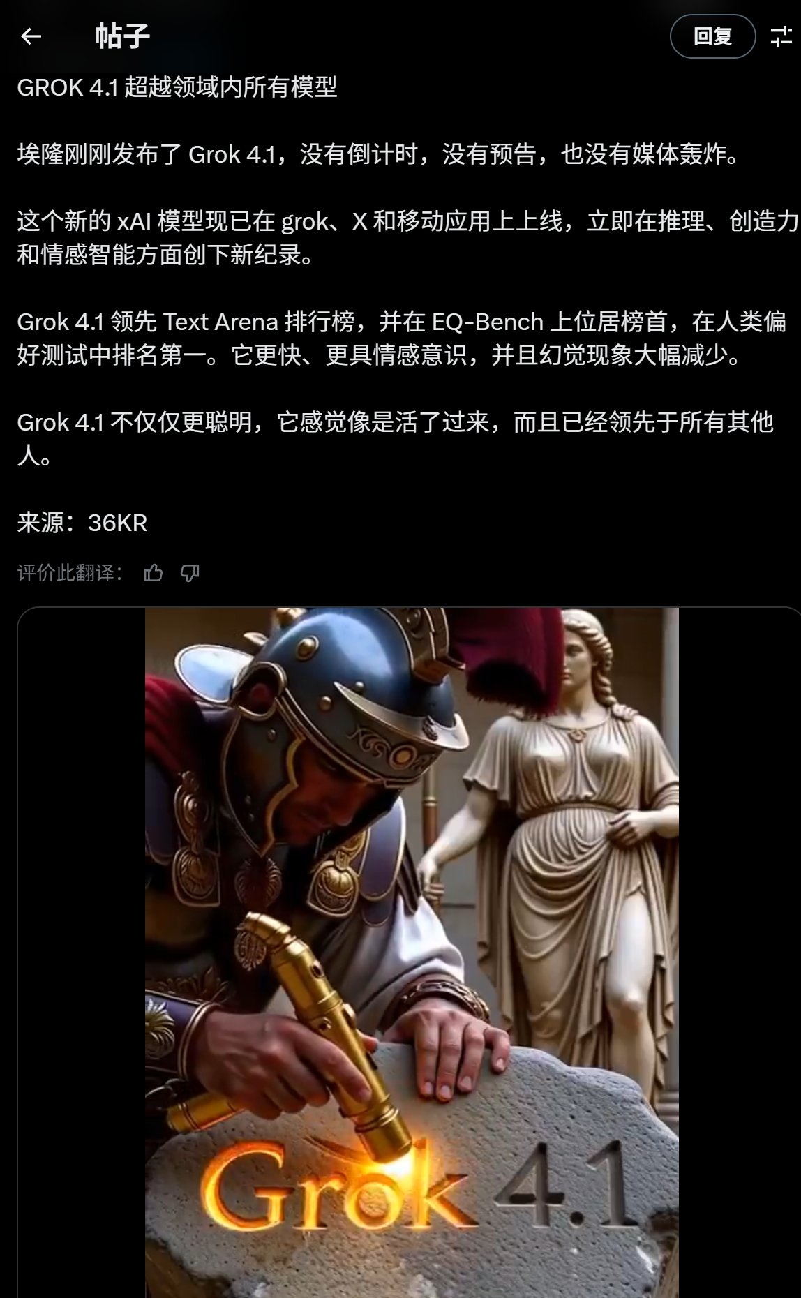 同样的第一条推文都很中性。就是简单清晰地表明Grok-4.1发布了,你可以明显感受到速度和质量的提升。