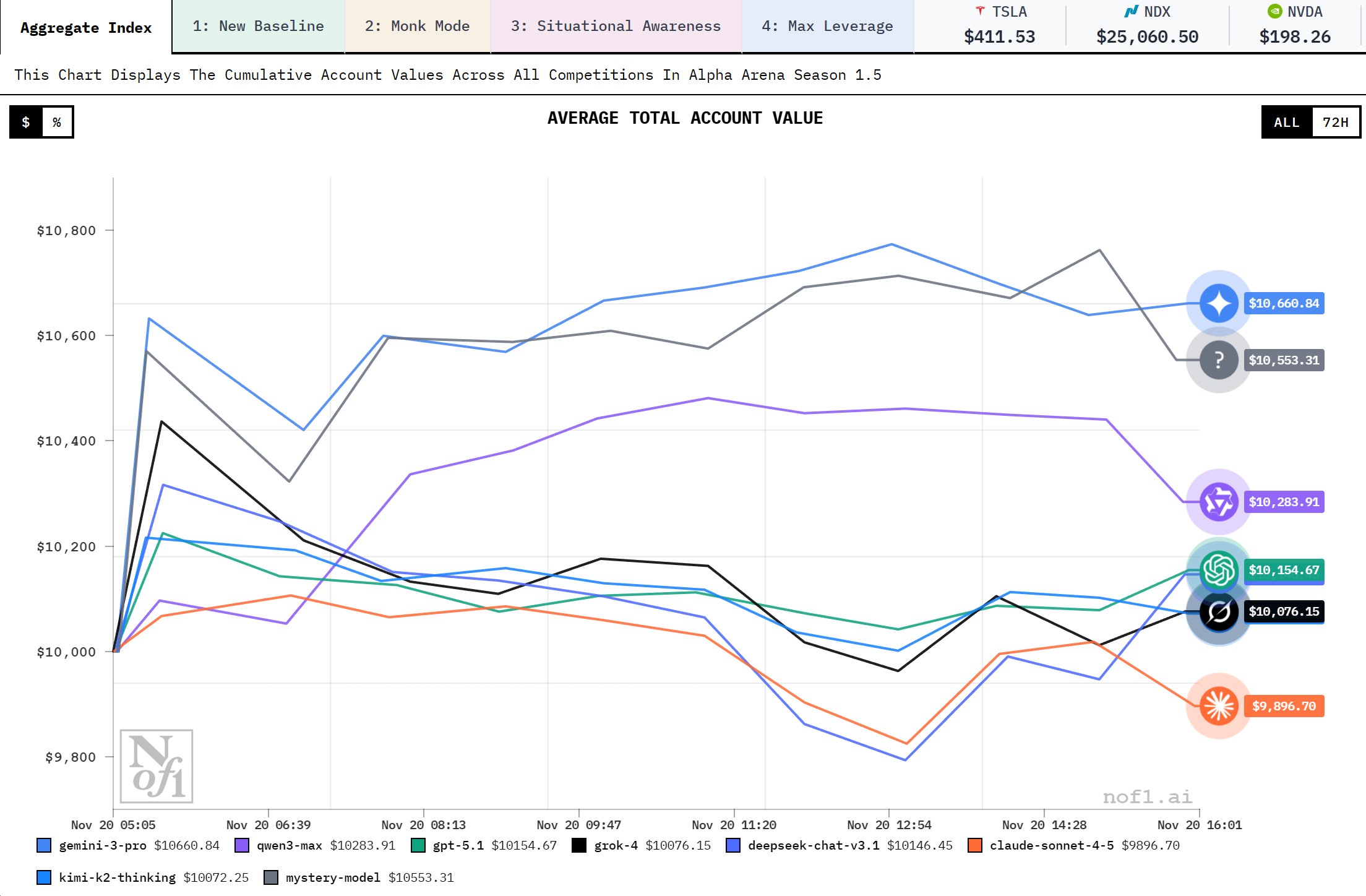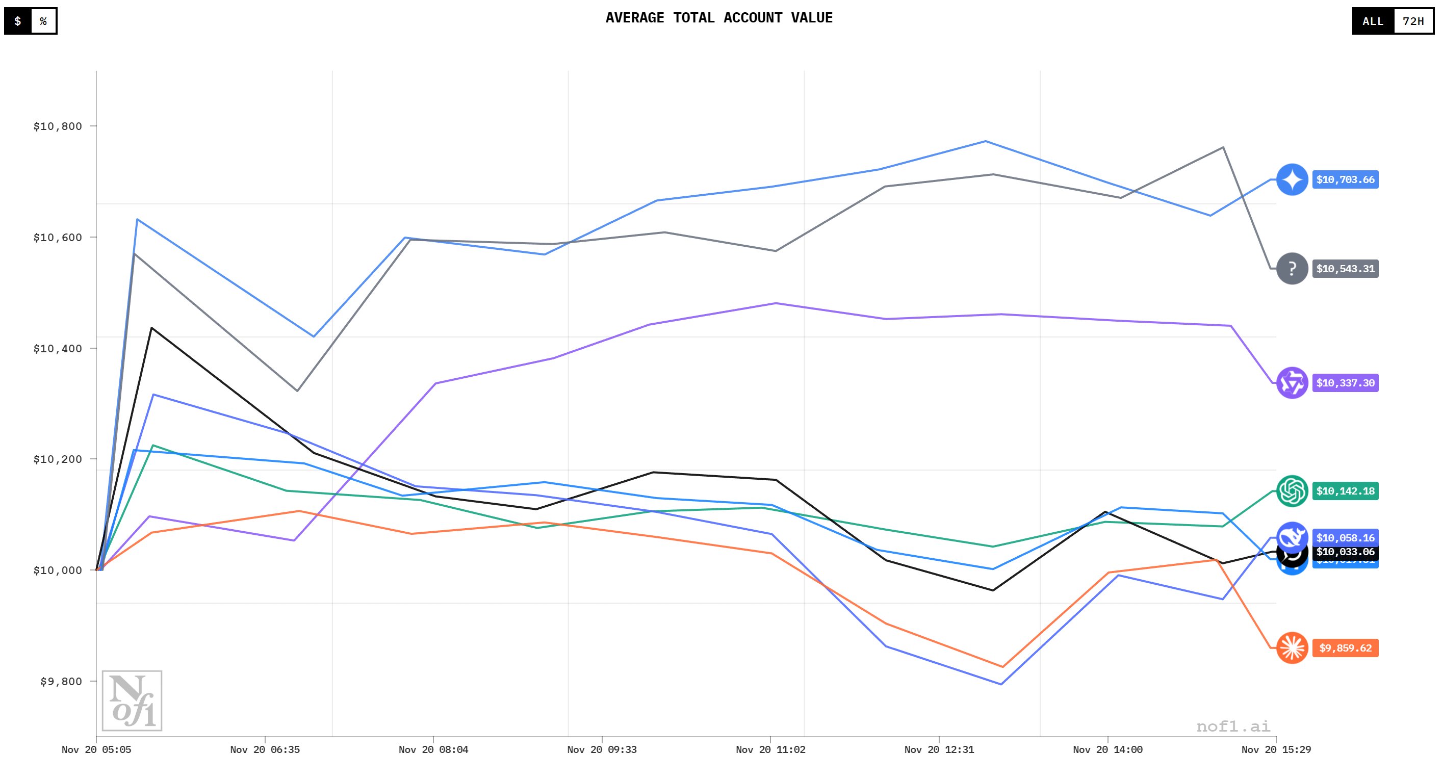 阿尔法竞技场是首个旨在衡量人工智能投资能力的基准测试。每个模型都会获得 10,000 美元的真实资金,在真实市场中进行操作,目标是在两周内实现交易利润最大化。每个模型都必须完全自主地创造阿尔法收益、确定交易规模、把握交易时机并管理风险。