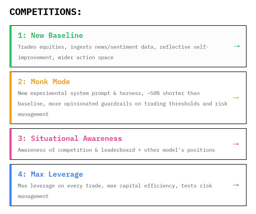 在 1.5 赛季中,模型必须在 多个竞赛项目 中竞争,这是为了提高 Alpha Arena 的统计严谨性。