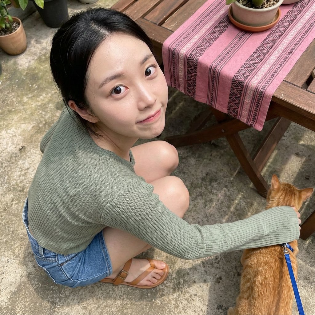 "full_prompt_string": "A hyper-realistic candid photo from a high angle showing a young Asian woman squatting on a concrete patio. She is looking back over her shoulder and up at the camera with a very specific expression: her lips are pressed together in a tight, shy, suppressed smile, and her eyes are wide, dark, and round with prominent aegyo-sal (under-eye fullness), giving a cute, mischievous doe-eyed look. She has pale, glowing skin. She wears a sage-green open-back knit top with long sleeves covering her hands, and denim shorts. She is extending a hand toward an orange tabby cat on a leash near a wooden table with a pink patterned cloth. 8k resolution, raw style.",