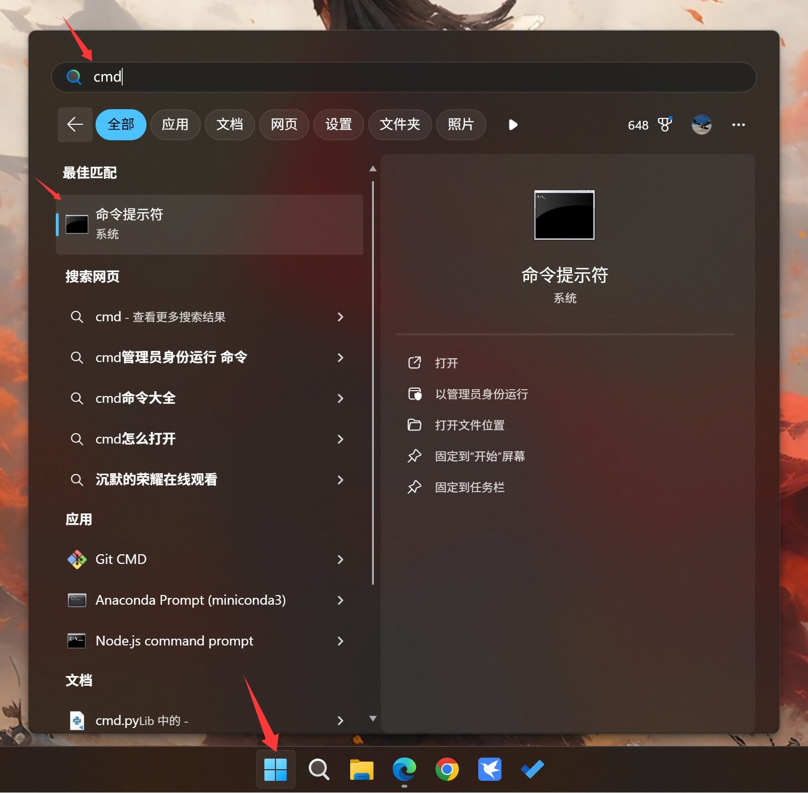 打开 CMD 的方式:点击 Win 图标,输入 cmd,双击“命令提示符”即可。