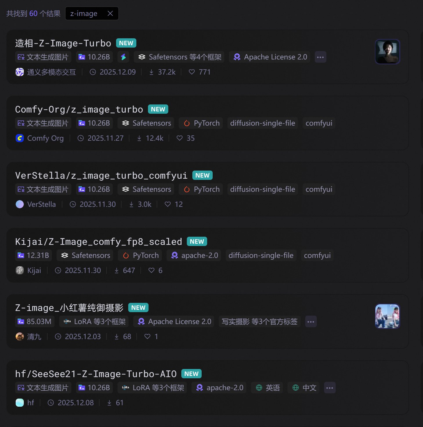 国内的魔搭社区上 Z-Image 相关的项目已经有 60 个了。