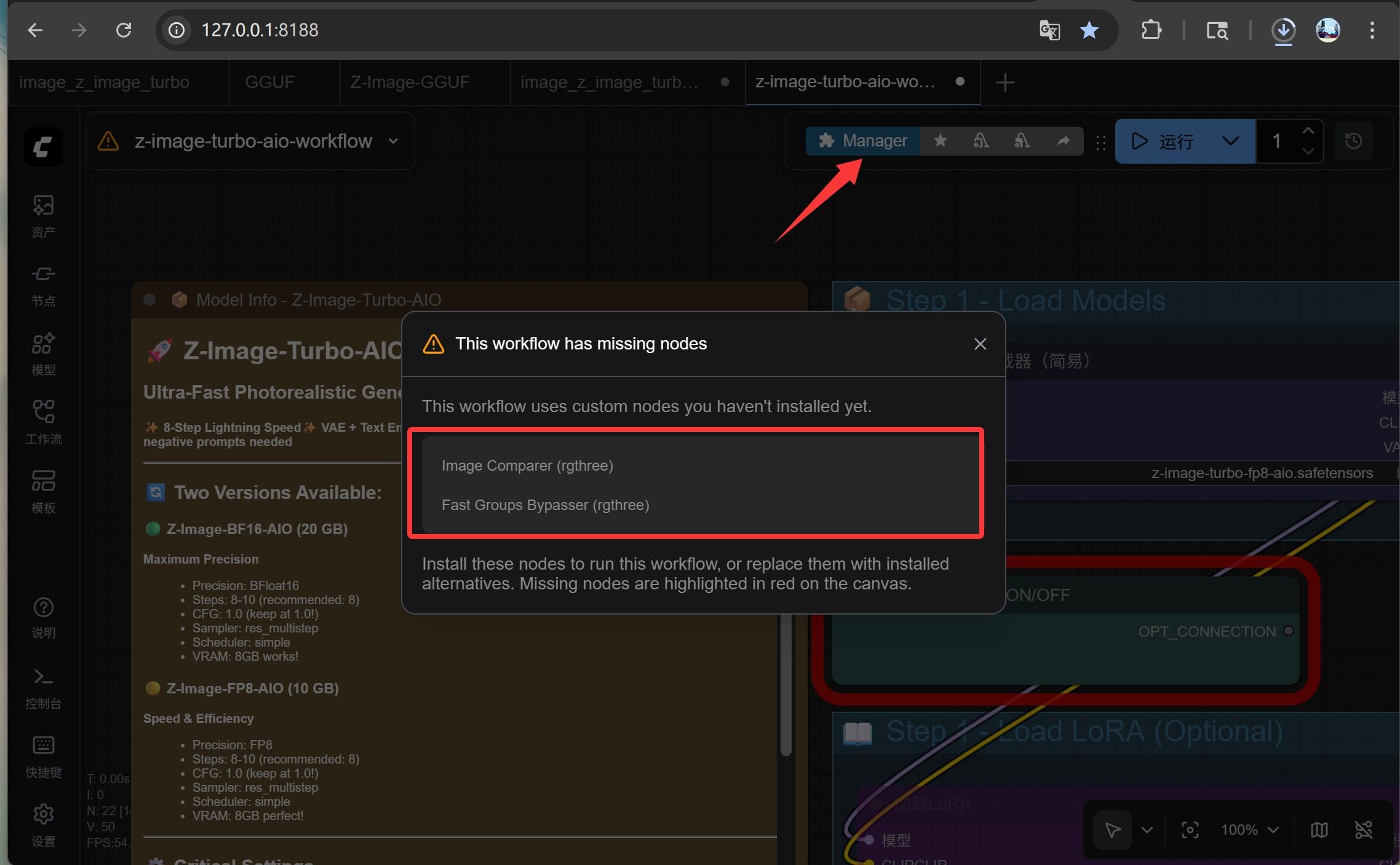 加载工作流之后,可能出现一个错误提醒。这是因为这个工作流用到了一个第三方节点。