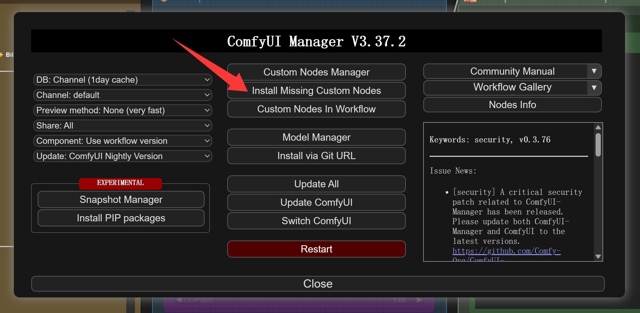 然后在弹出的菜单中点击 安装缺失插件(Install Missing Custom Nodes)。