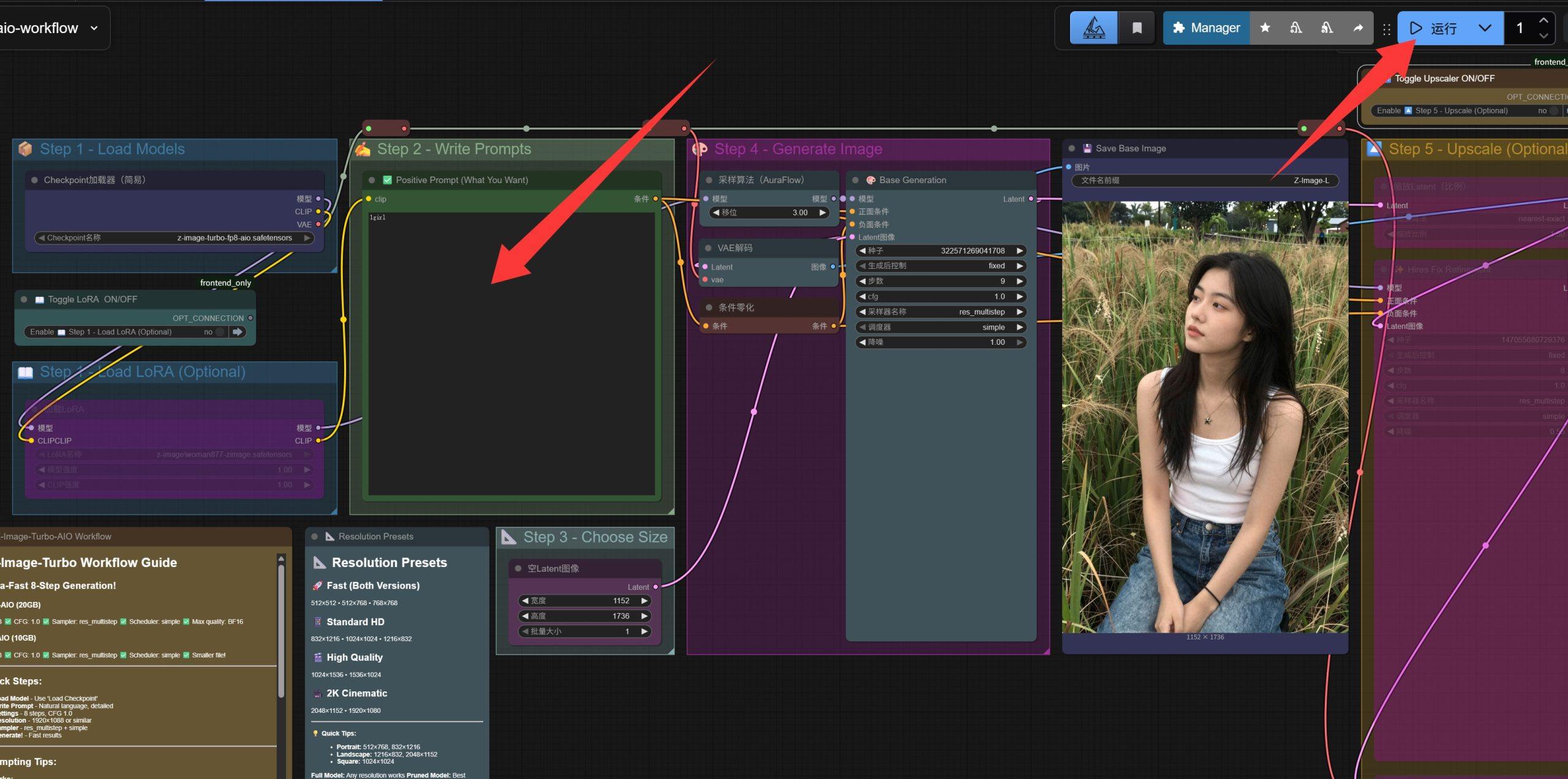 这两步还不会的话,请参考之前的文章。工作流在上方的截图中可以获取,就是名为 z-image-turbo-aio-workflow.json 的文件。当然,软件、工作流、模型,我会在文末分享。