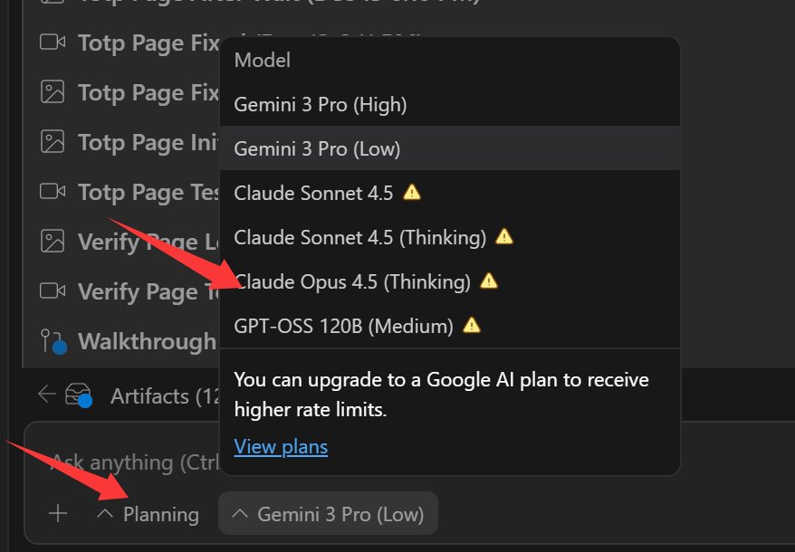 接下来就是选择 Planning 模式,然后选择 Claude Opus 4.5(Thinking)模型。