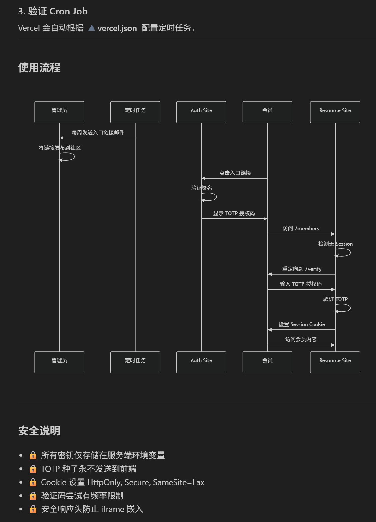 [定时任务] ↓(每周)生成新入口链接(带签名) ↓发邮件给你 ↓你贴到社区 ↓[生成授权码页面] —— TOTP ——> [资料网站]