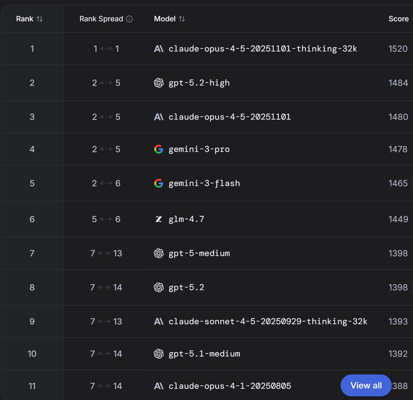 GLM4.7 和MiniMax 确实是有点东西的。但是不清楚这个榜单有多少水分。