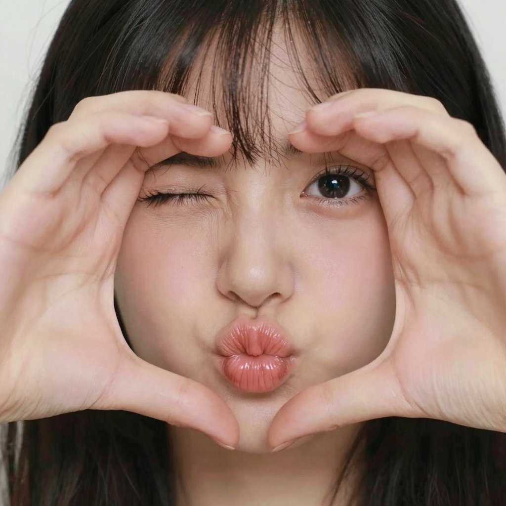 "foreground_elements": "hands forming a heart shape in front of the face"