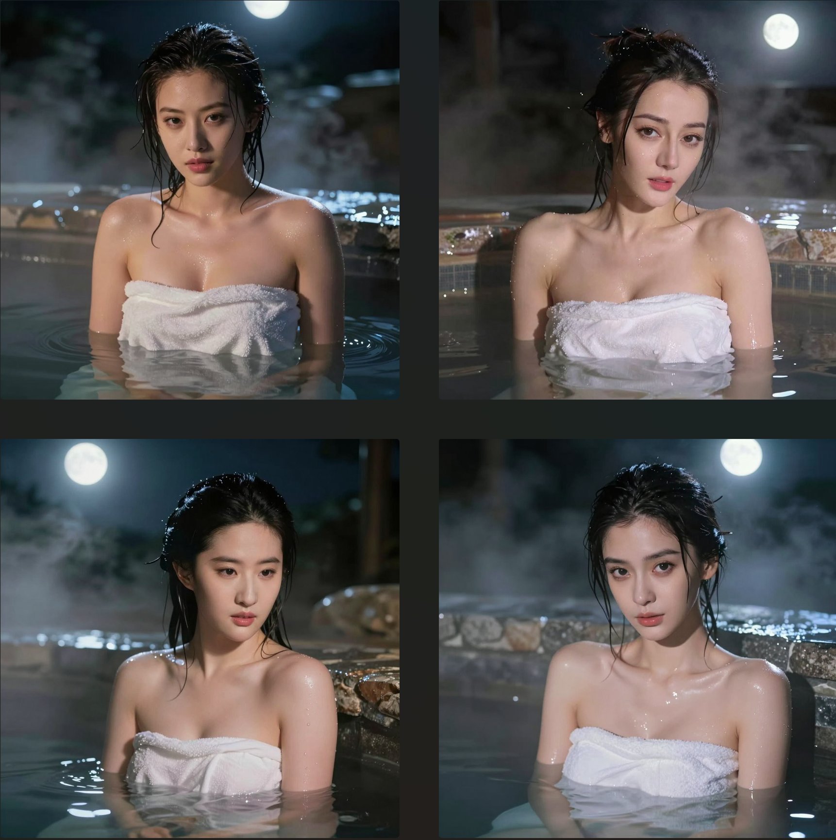 一位年轻亚洲女子(演员:杨幂)在夜晚的温泉中放松身心,胸前仅裹着一条薄薄的毛巾,表情羞涩又迷人,眼神带着诱惑,周遭蒸汽缭绕,月光洒落在湿润的肌肤上,高质感 8K,精致细节。