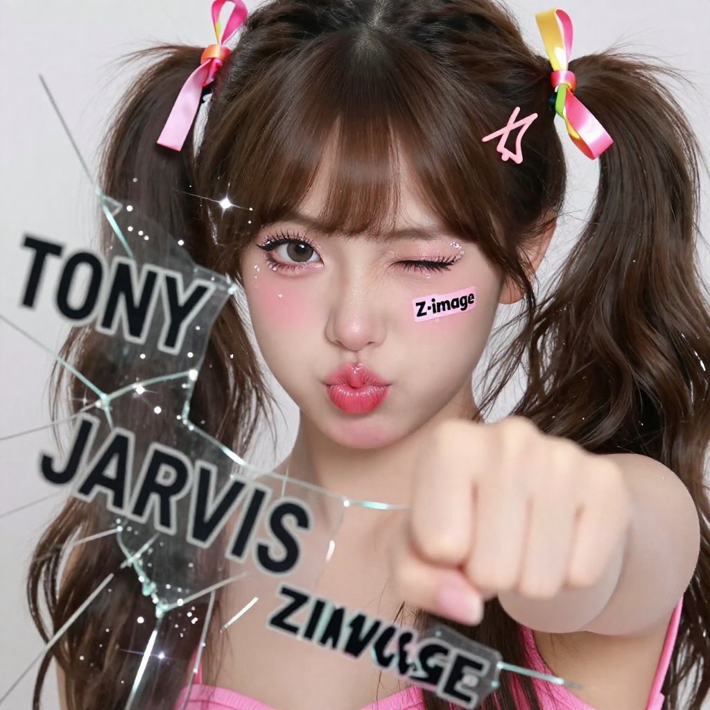 一张特写镜头,捕捉了一位神情软萌甜美的女孩。她扎着柔软蓬松的双马尾,并用鲜艳丝带装饰,散发着俏皮与青春的活力。她正对镜头调皮地眨着一只眼,眼中闪烁着欢快的光芒,浓重的眼妆凸显出长长的睫毛和眼线笔触末端那富有光泽的装饰性点缀。她嘟起嘴唇,可爱饱满的双唇涂着鲜艳亮丽的粉色唇彩。她脸颊上贴着“Z-image"字样的贴纸,头部微微侧倾,做出战斗姿势,右手握拳直面镜头出拳,击打在她正面的整块玻璃,玻璃应声破碎,玻璃上分别写着"TONY”,"JARVIS","ZIMAGE”的字样也全部破碎掉落。她肌肤的水润质感、眼中的璀璨星光,以及每一处细腻细节交织在一起,共同营造出一幅洋溢着青春欢乐但又力量十足的图像。