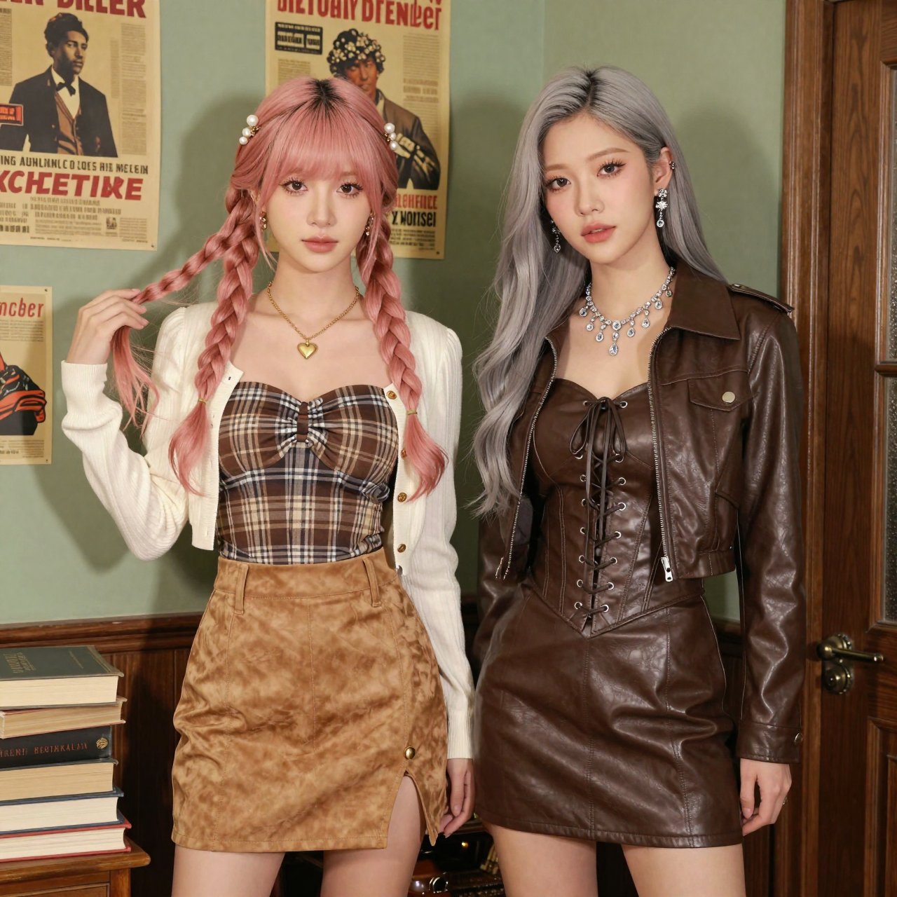 两位年轻亚洲女性时尚肖像,复古室内场景。左侧女生粉色长发双马尾辫配珍珠发饰,棕色格纹抹胸上衣配泡泡袖、白色开衫、棕褐色麂皮短裙,金色心形项链。右侧女生银灰色长发,深棕色皮革束腰上衣配系带细节、皮夹克和短裙,水晶颈链,精致耳环。复古海报墙面,鼠尾草绿墙壁,木门框,堆叠书籍,温暖怀旧光线,高质量时尚摄影