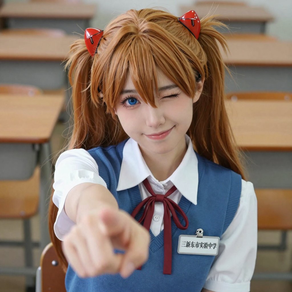 《新世纪福音战士》明日香cos,鹅蛋脸,蓝眼睛,穿着校服,微笑,眨眼,低头但眼睛看向观众,手指指向观众。角色胸口挂着“三新东市实验中学”中文字样的铭牌