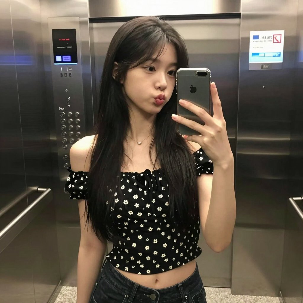 着镜子自拍。她穿着一件带有白色花朵图案的黑色露肩短上衣和深色牛仔裤。她的头