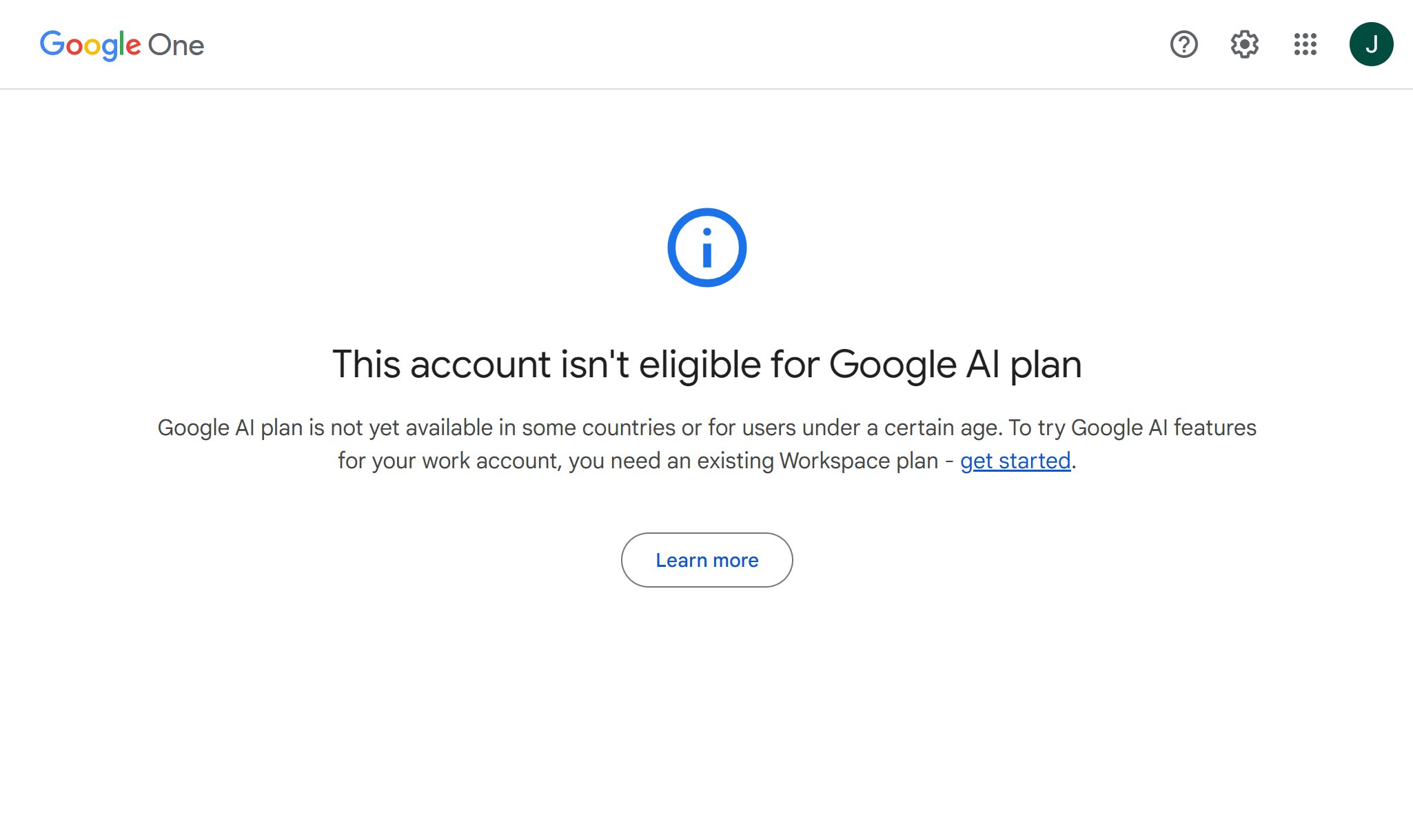 This account isn’t eligible for Google AI plan Google AI plan is not yet available in some countries or for users under a certain age. To try Google AI features for your work account, you need an existing Workspace plan – get started.