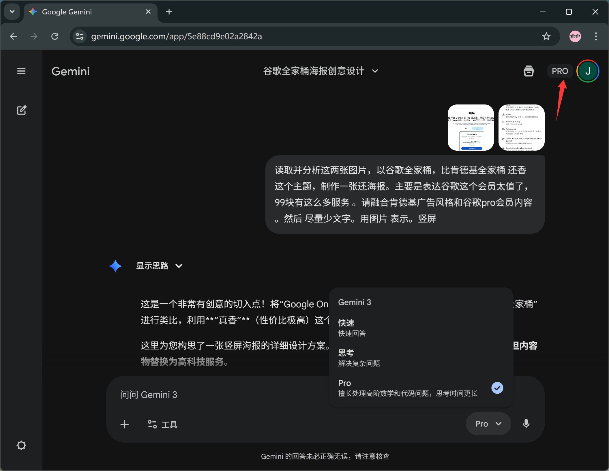 打开 gemini.google.com 看到右上角有个 Pro 标志,证明你的 Gemini 已经是专业版了,可以畅享 Gemini3 Pro 模型。 如果不是 Pro 用户,大概只能用几次,就提示配额不够了。