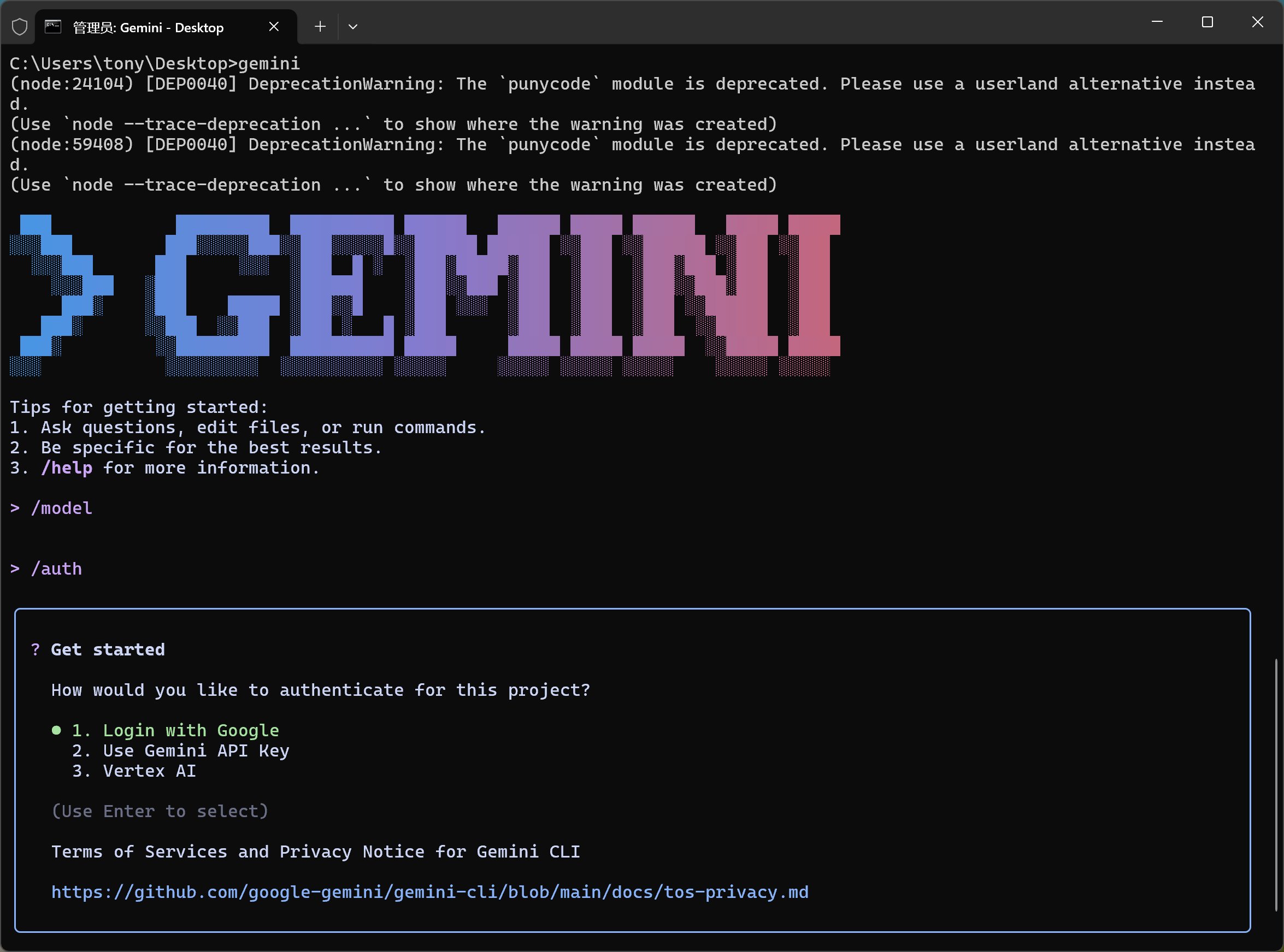 打开 Gemini,输入 /auth 可以登录你已经开通 Pro 的账号。