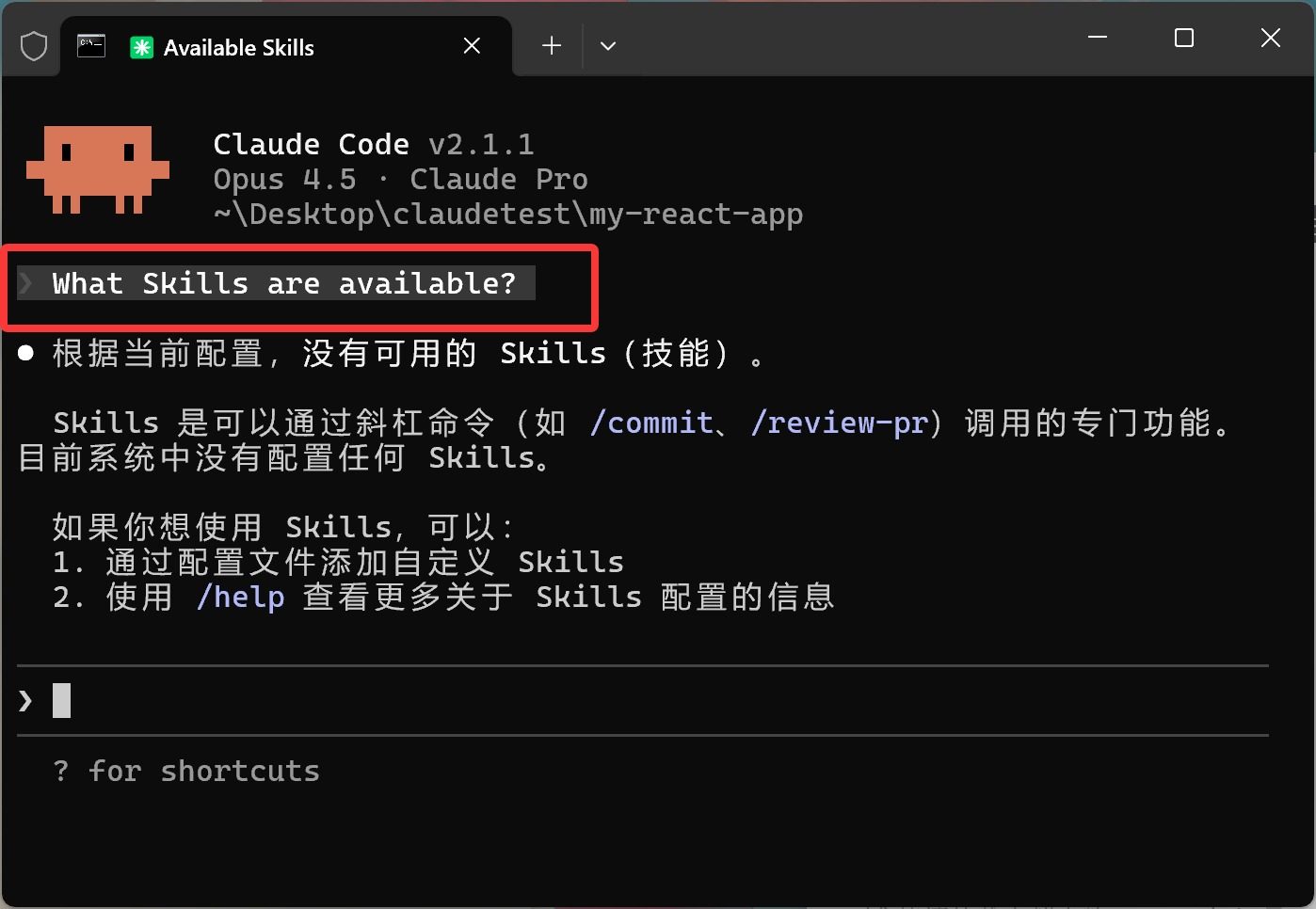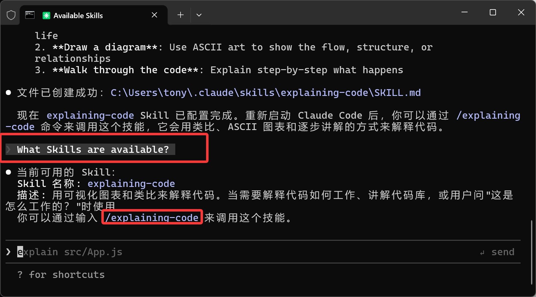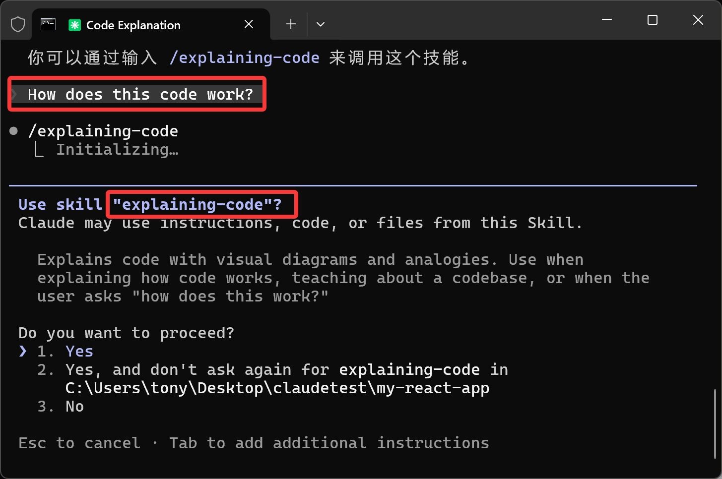 CC 会告诉你,当前可以用的技能是 explaining-code。