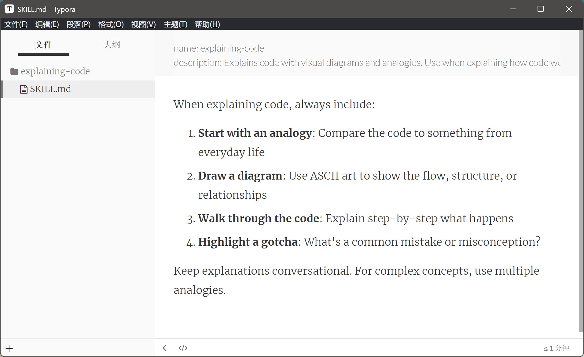 所以技能文件保存在用户目录下,技能名称为 explaining-code。