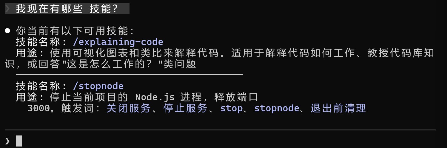 它就会告诉你有两个技能,一个是用户级别的代码解释技能,一个是项目级别的停止服务技能。