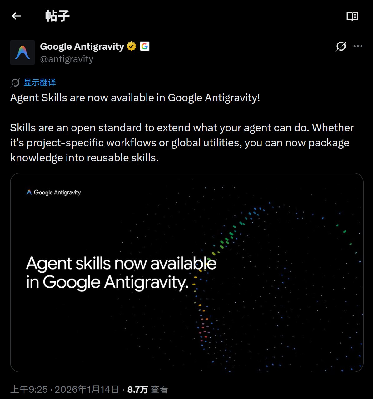Google Antigravity 官方账号今天发了 一条推特。表示”Antigravity 也支持技能了”
