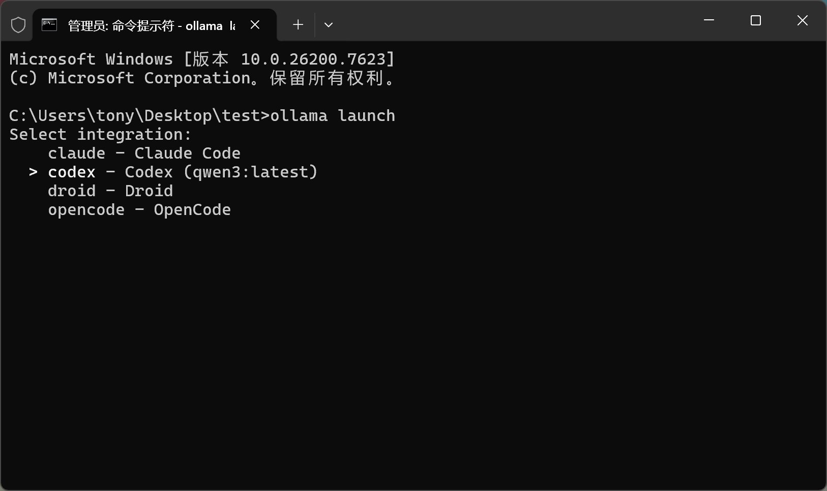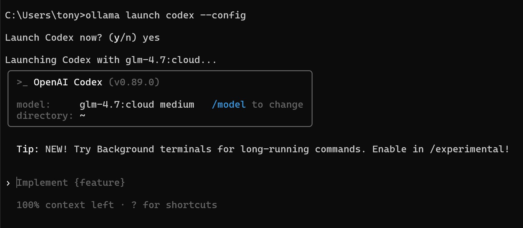C:\Users\tony>ollama launch codex --configSelect model for Codex: > qwen3:latest bge-m3:latest deepseek-r1:14b devstral:latest gemma3:12b gemma3:1b glm-4.7:cloud gpt-oss:20b minicpm-v:latest qwen2.5vl:latest ... and 4 more