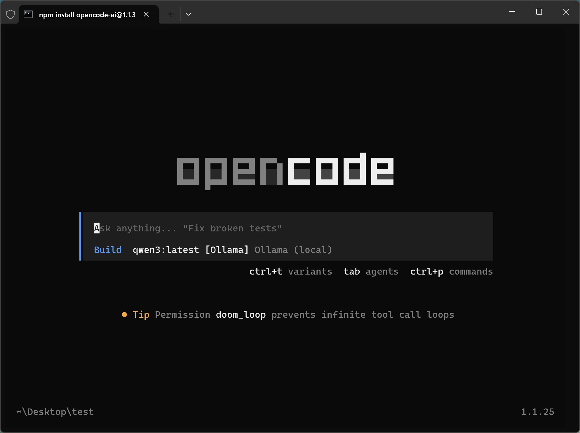 ollama launch opencode --model qwen3:latestThis will modify your OpenCode configuration: C:\Users\tony\.config\opencode\opencode.json C:\Users\tony\.local\state\opencode\model.jsonBackups will be saved to C:\Users\tony\AppData\Local\Temp\ollama-backups/Proceed? (y/n)