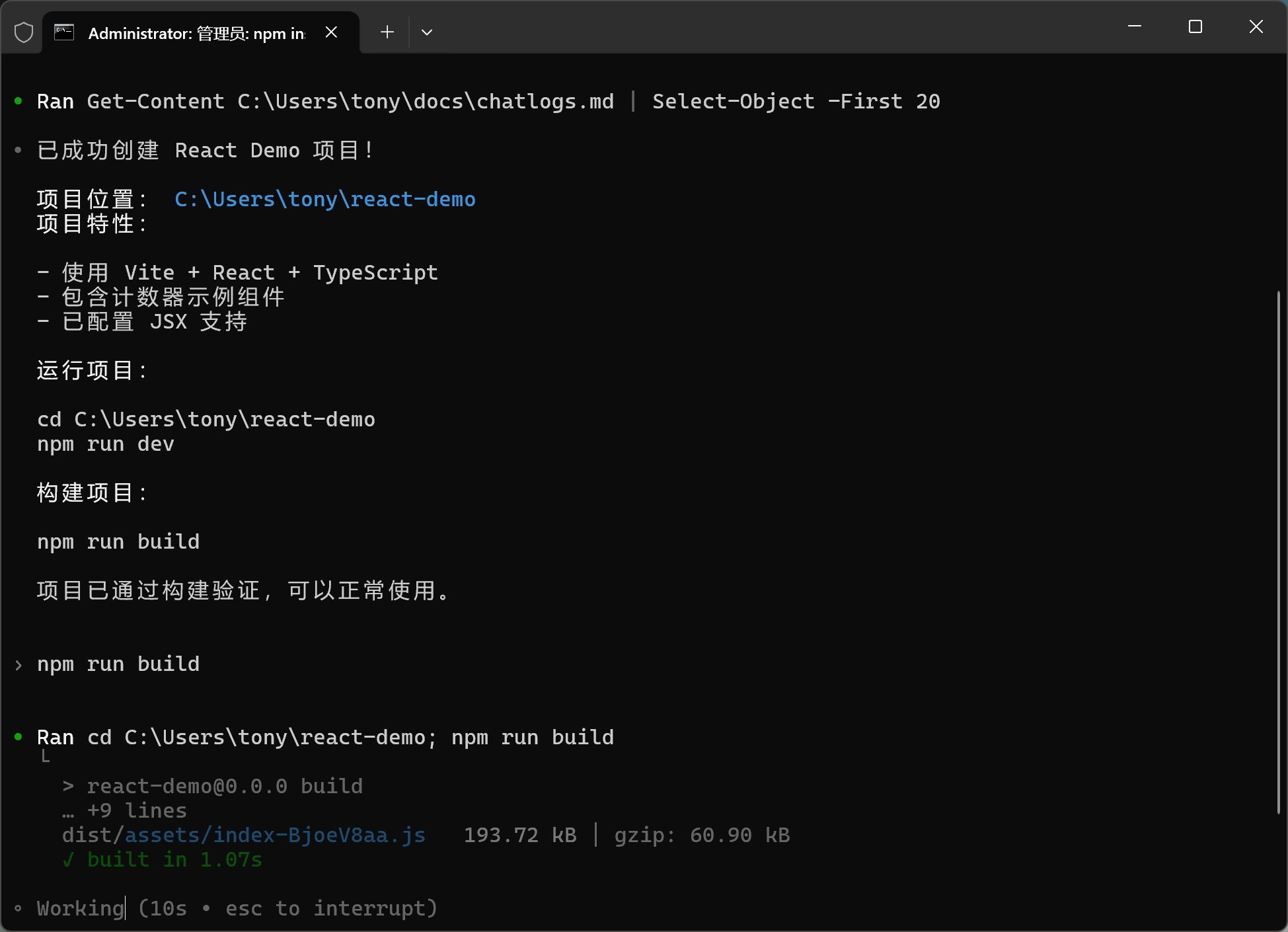 就可以在命令行里面直接输入,比如说:“帮我创建一个 React 的 Demo 项目”,它就会自动调用各种工具帮你创建项目。