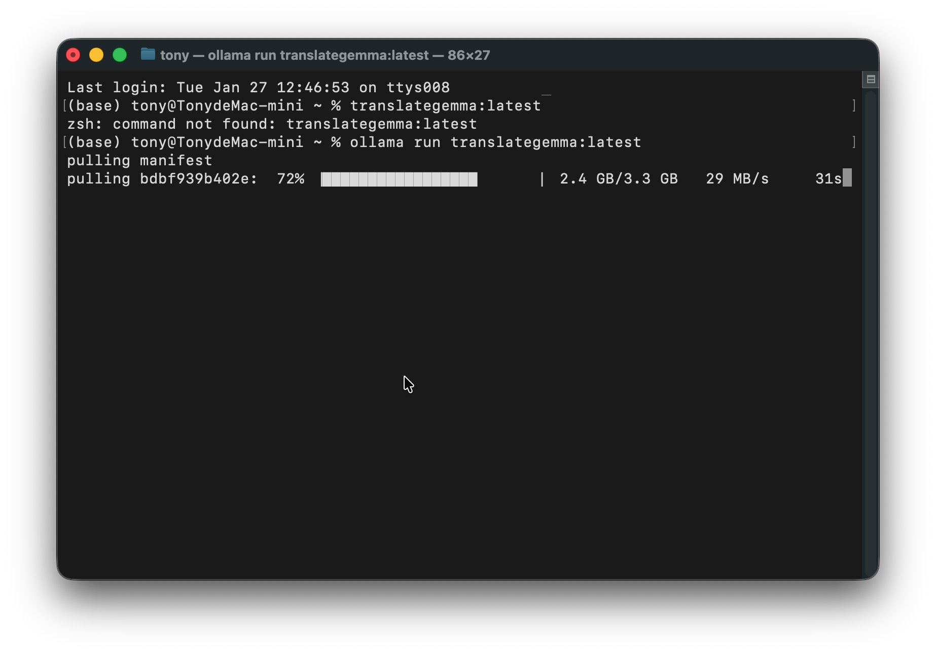 有了Ollama之后,就可以通过它来下载模型了。 我们今天用到的模型叫做translategemma。这个模型分了三个版本,分别是4b,12b,27b。数字越大越强。