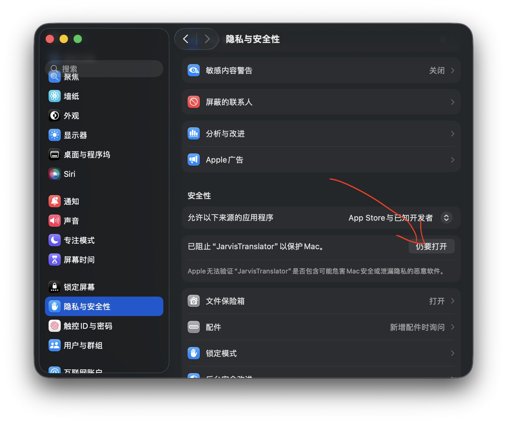 这个地方应该会显示:已经阻止 Jarvis Translator 以保护 Mac。点一下后面的“仍要打开”按钮。