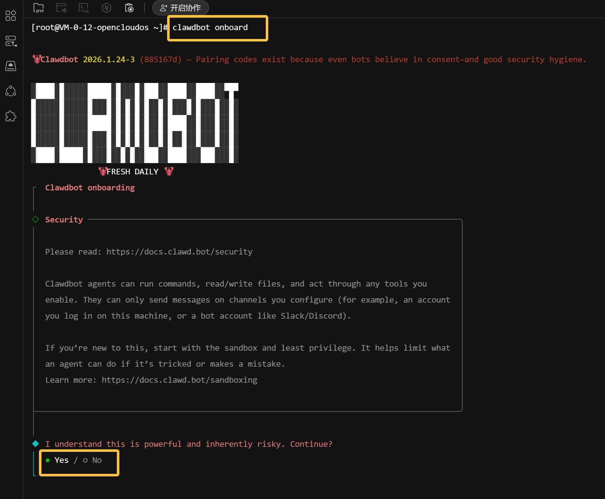 目前腾讯云提供了两个版本,我们刚开始装的是老版本,所以命令还是老的命令,以 clawdbot 开头,使用这个新版本安装之后,命令就和官方文档同步了。
