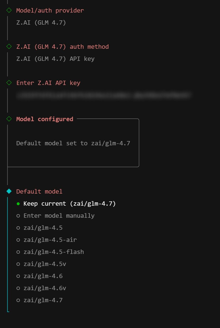 选中 Z.AI 之后,会让你输入 API key 和选择模型。