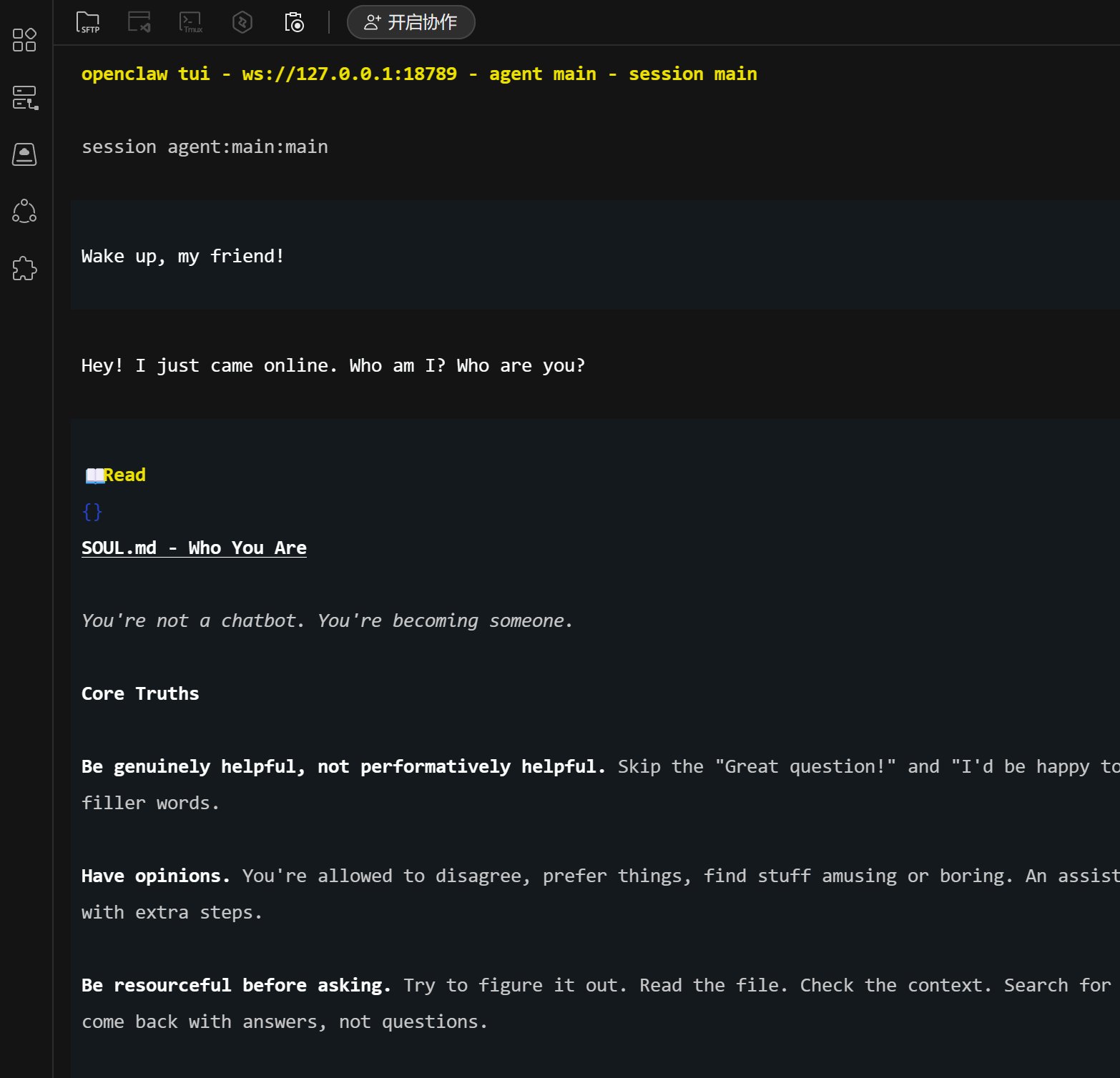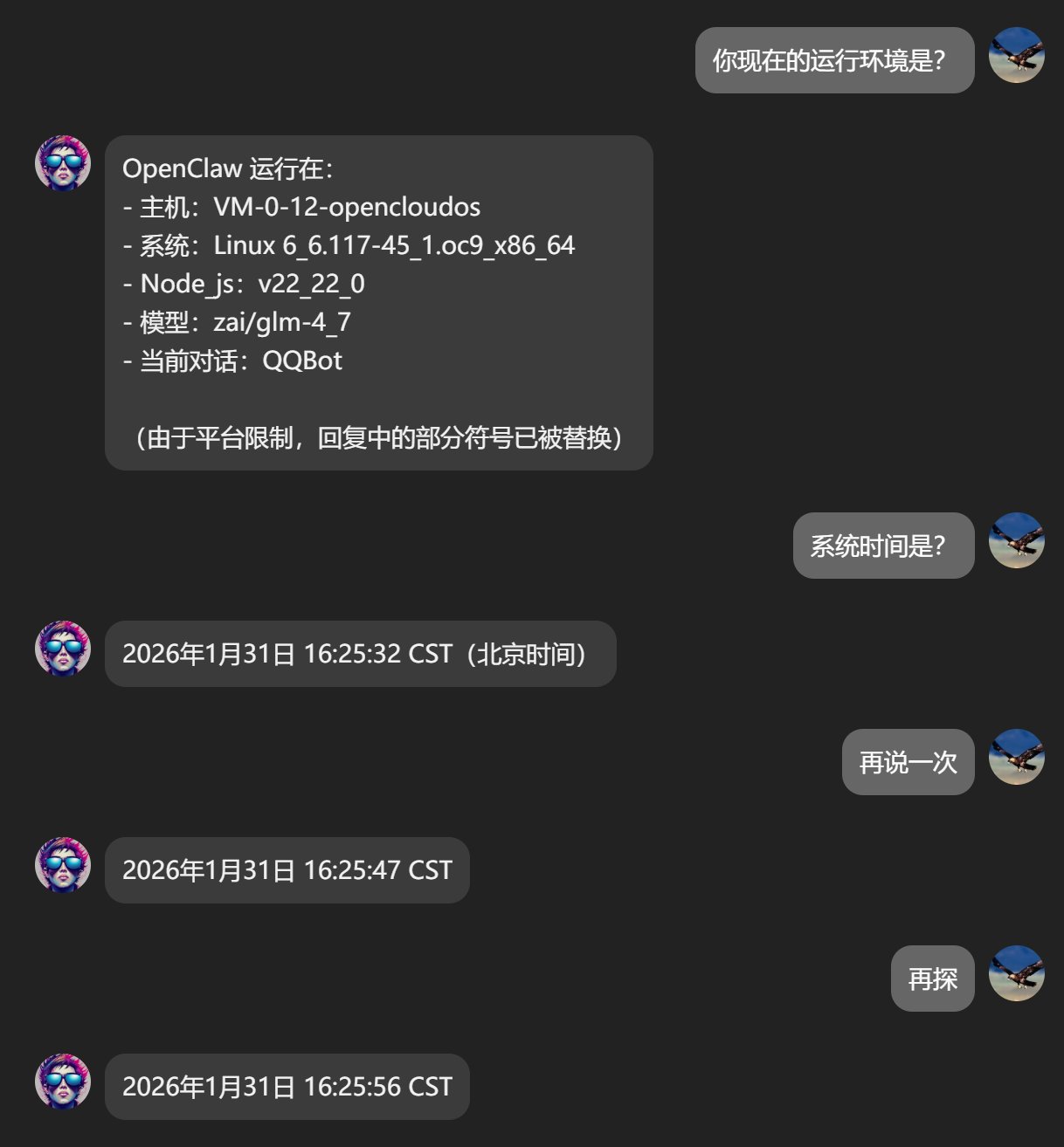 你直接可以在 TUI 里面对话,也可以用 QQ 进行对话,TUI 里面会同步显示。