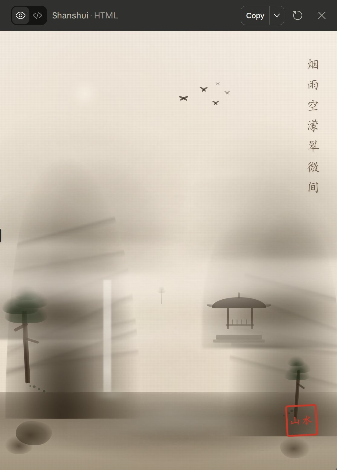 另外 Claude 还加了一句诗“烟雨空濛翠微间”,然后右下还有一个“山水”印章。这个意境真的是拉满了。