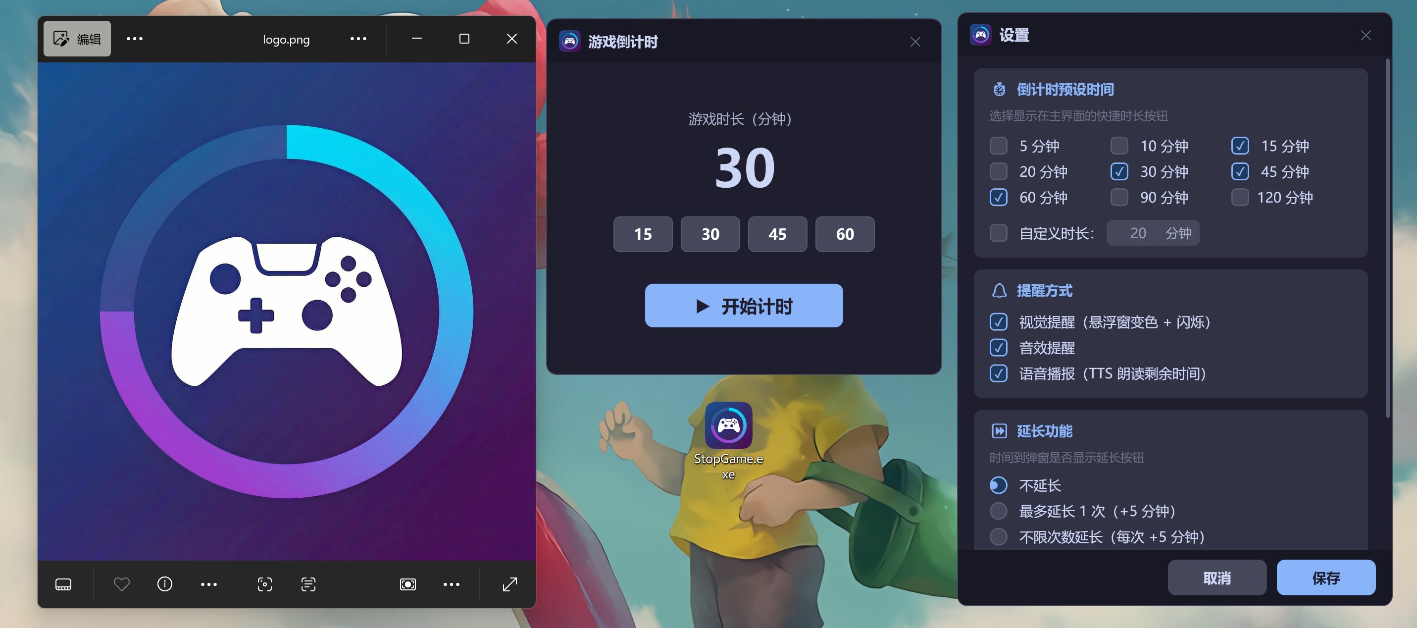 和小孩子约定每天一起玩游戏,但常常忘了时间,或到时间了拖拖拉拉不肯退出。 需要一个工具:角落显示倒计时 → 时间快到提醒 → 时间到自动退出游戏。