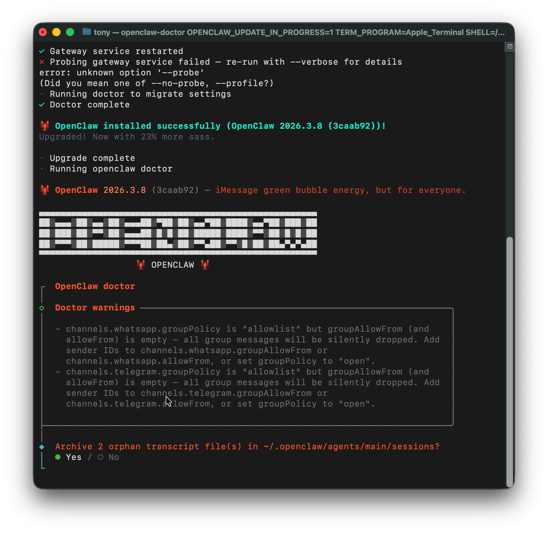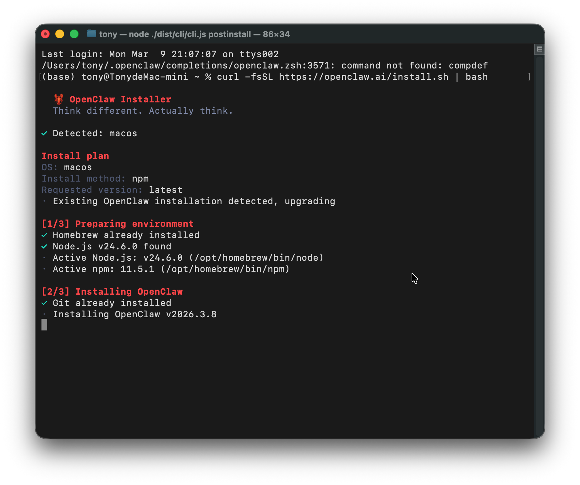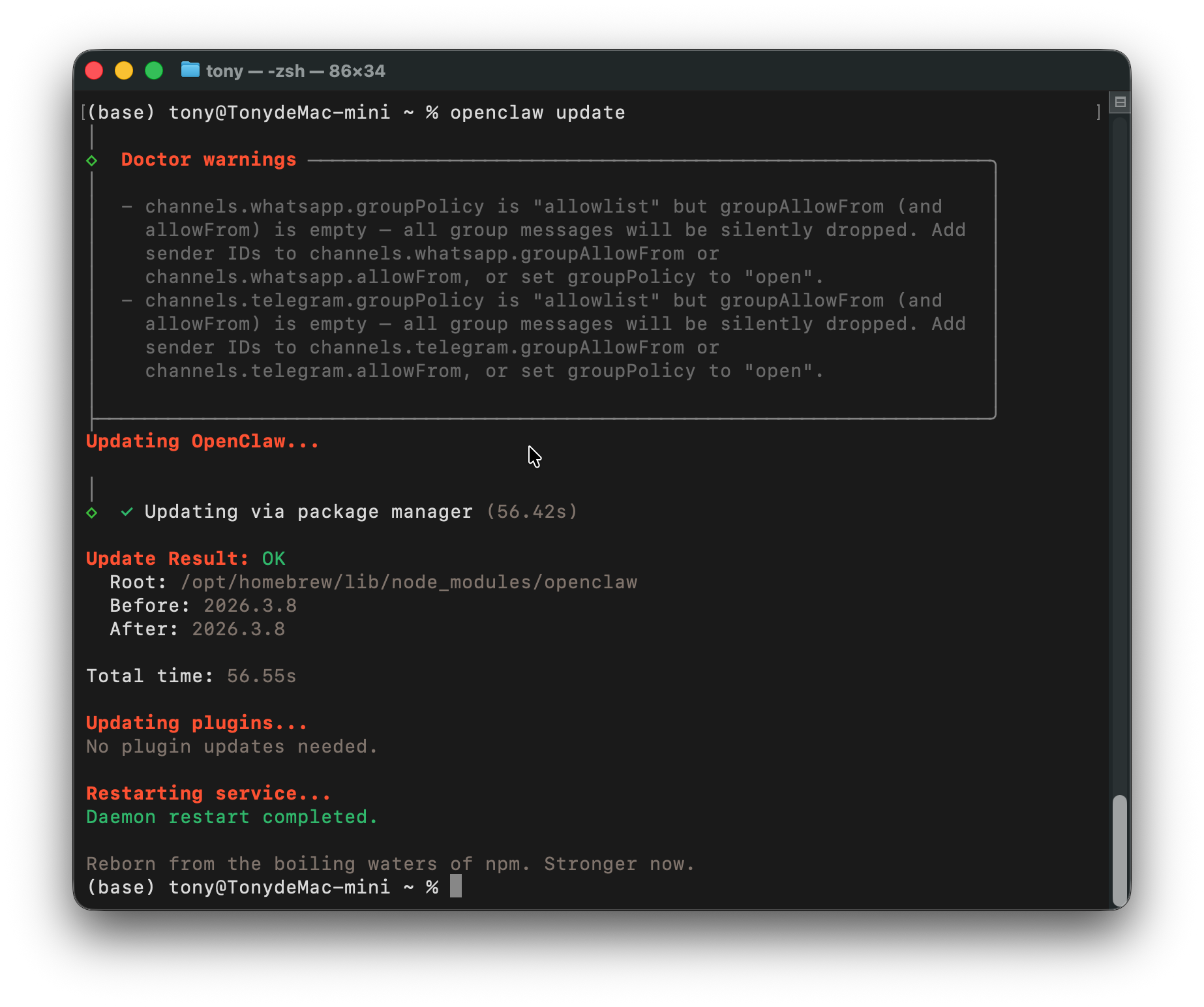 我本地之前是装过 OpenClaw 的,为了使用 GPT5.4,首先需要更新到 v2026.3.7+ 的版本。
