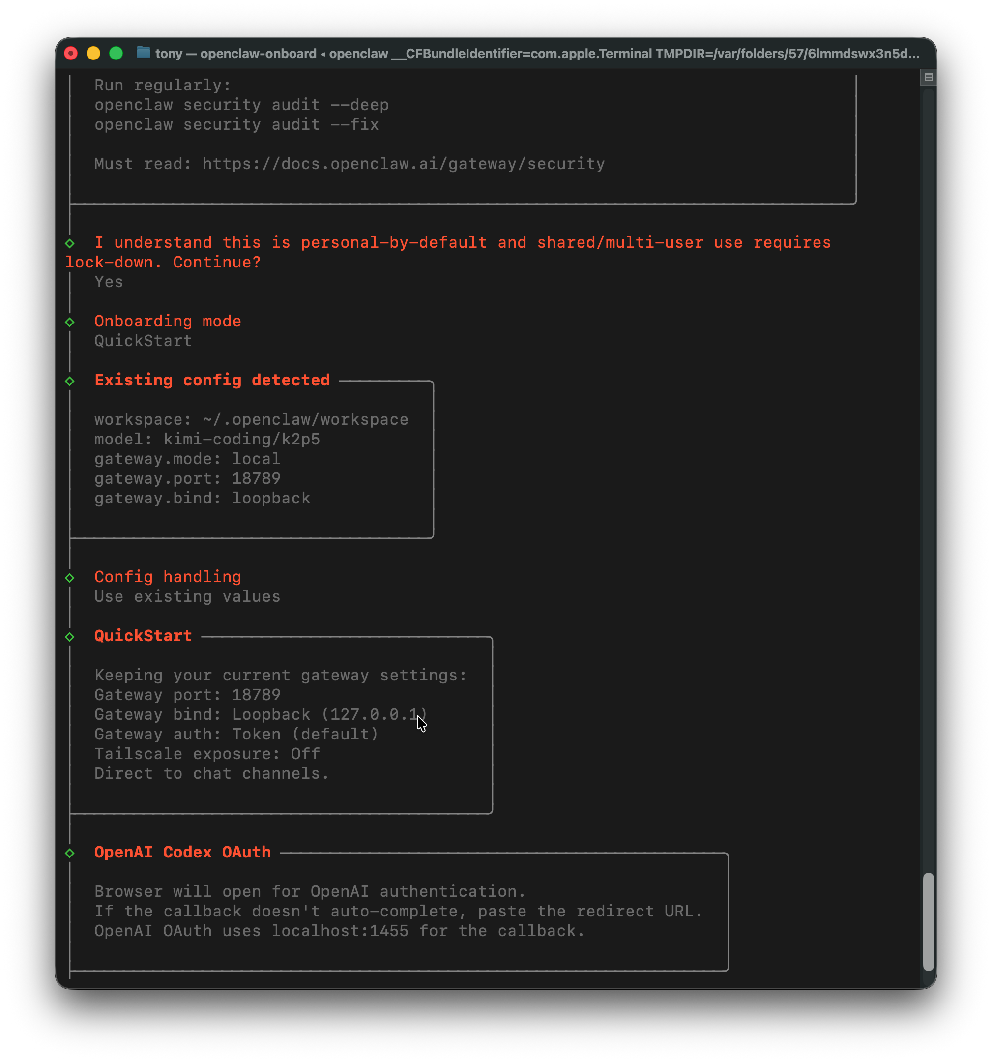选择 Yes 之后,选择 QuickStart,选择 Use existing values。因为我是已经装过了,所以这里提供的首选项是使用已经存在的值。新装的应该会让你选择配置提供商,那么应该是选择 OpenAI 进行授权登录。