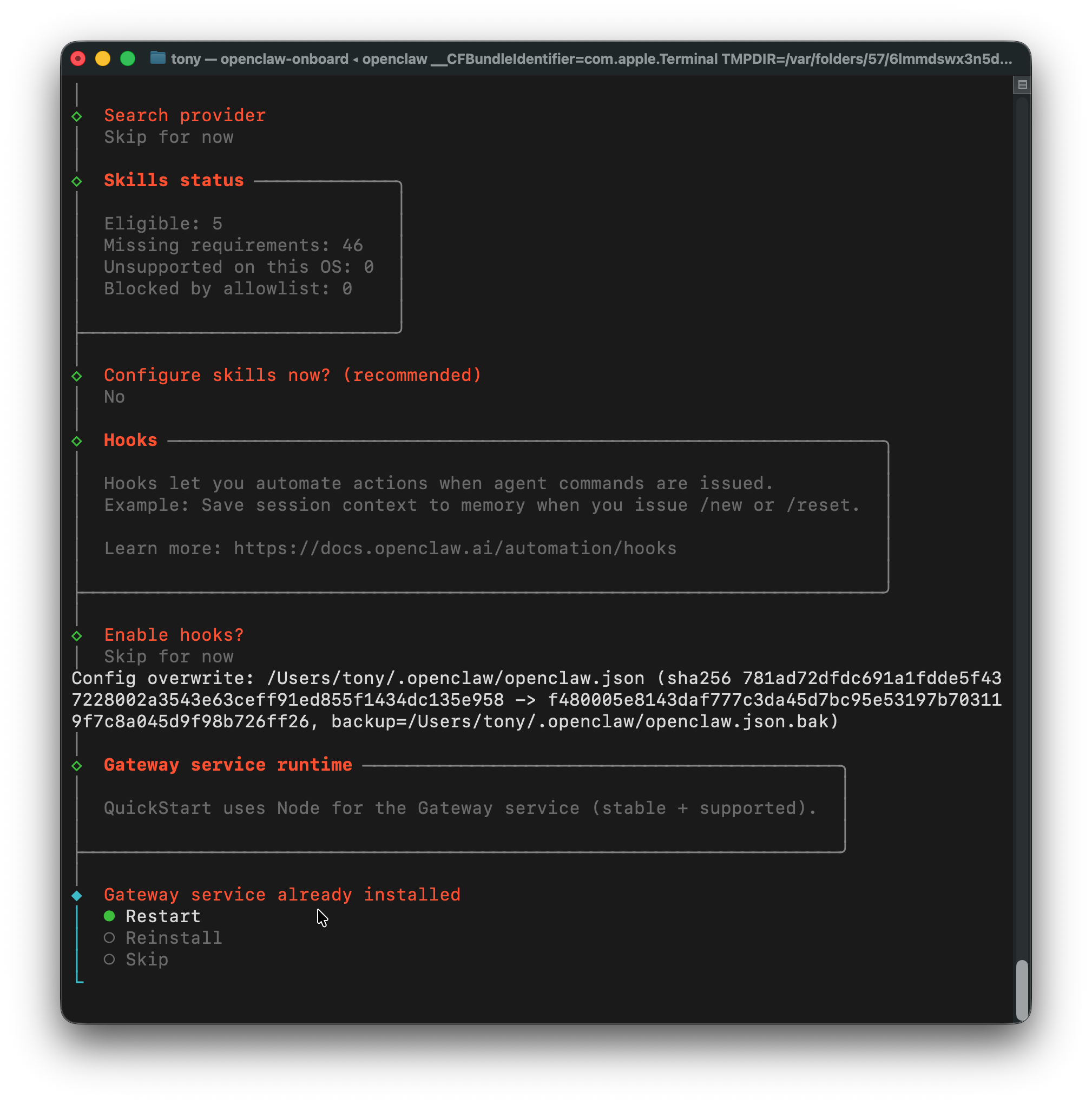 接下来让你配置搜索 API、技能、Hooks,全部可以跳过,就是选 skip 相关的选项。