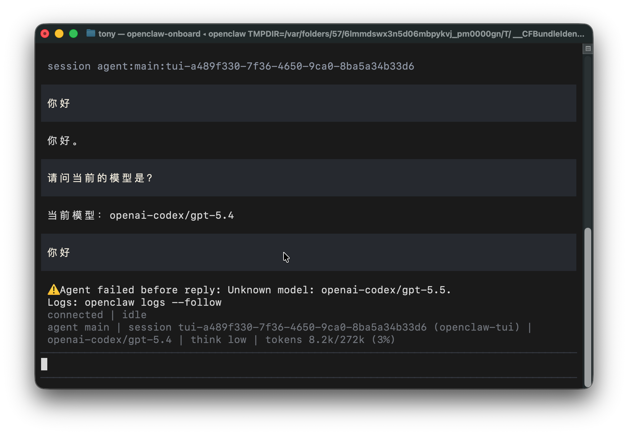 为了对比验证,我把配置文件中的模型改成 gpt5.5,再问的话立马就不行了。这样可以侧面证明 gpt-5.4 确实是生效了,而且必须是这个名字。
