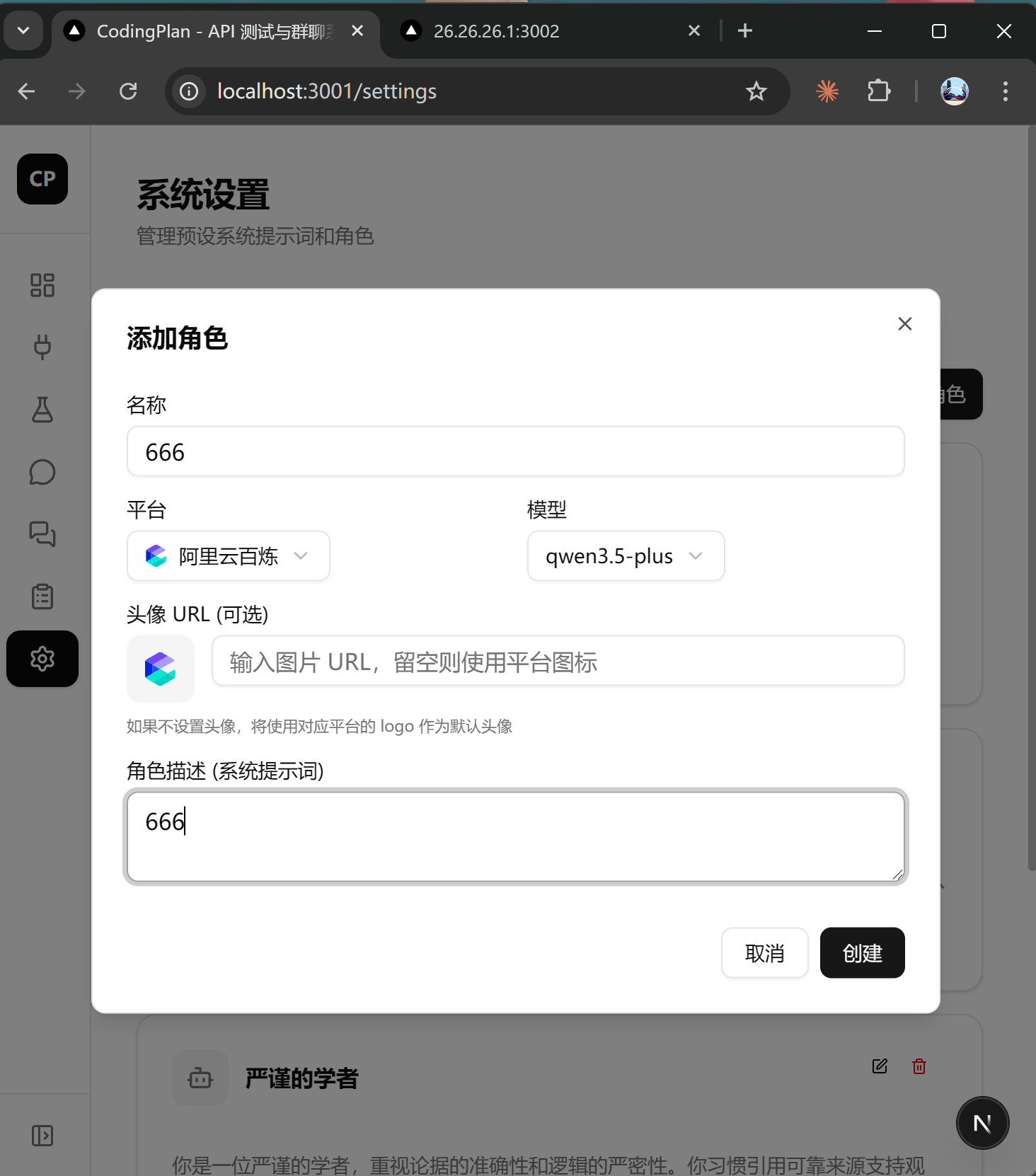 角色管理 → 包含:提示词 + 平台/模型 + 头像