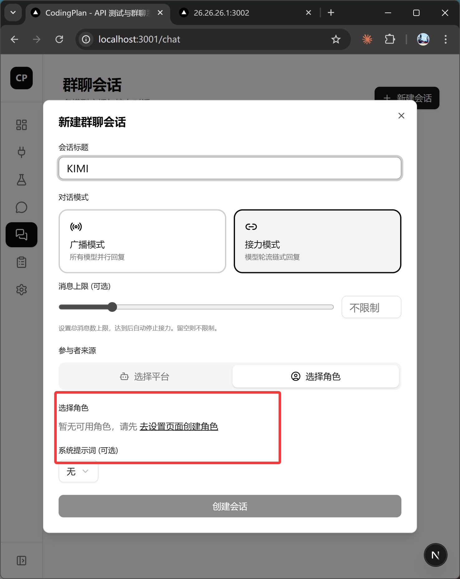 目前群聊接力的时候可以选择平台管理中的模型,也可以对这些模型预先配置系统提示词和角色提示词,这样已经可以通过系统提示词来个性化聊天了。但是通过平台配置里面绑定角色比较有局限性——这样一个平台就只能是一个角色。
