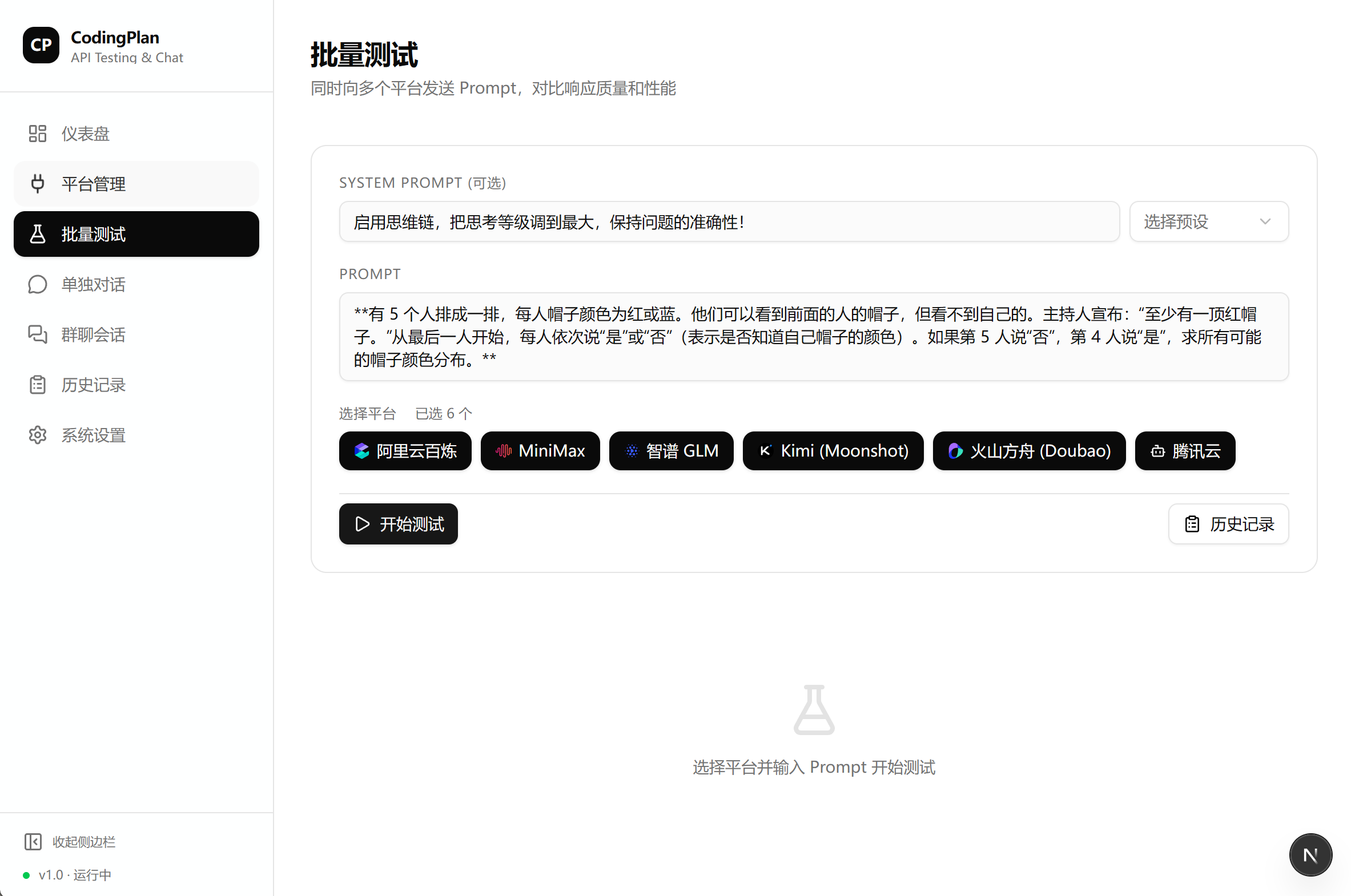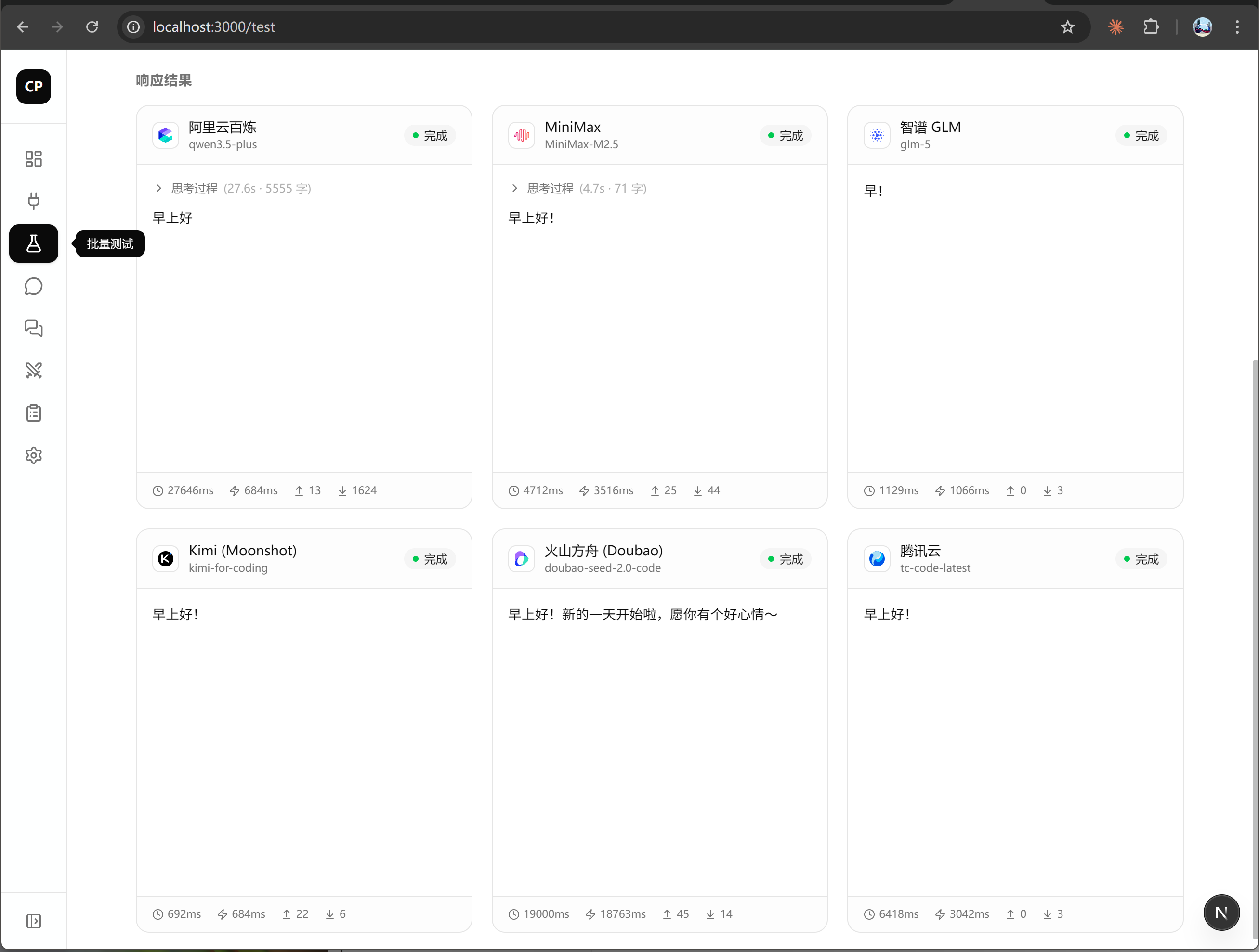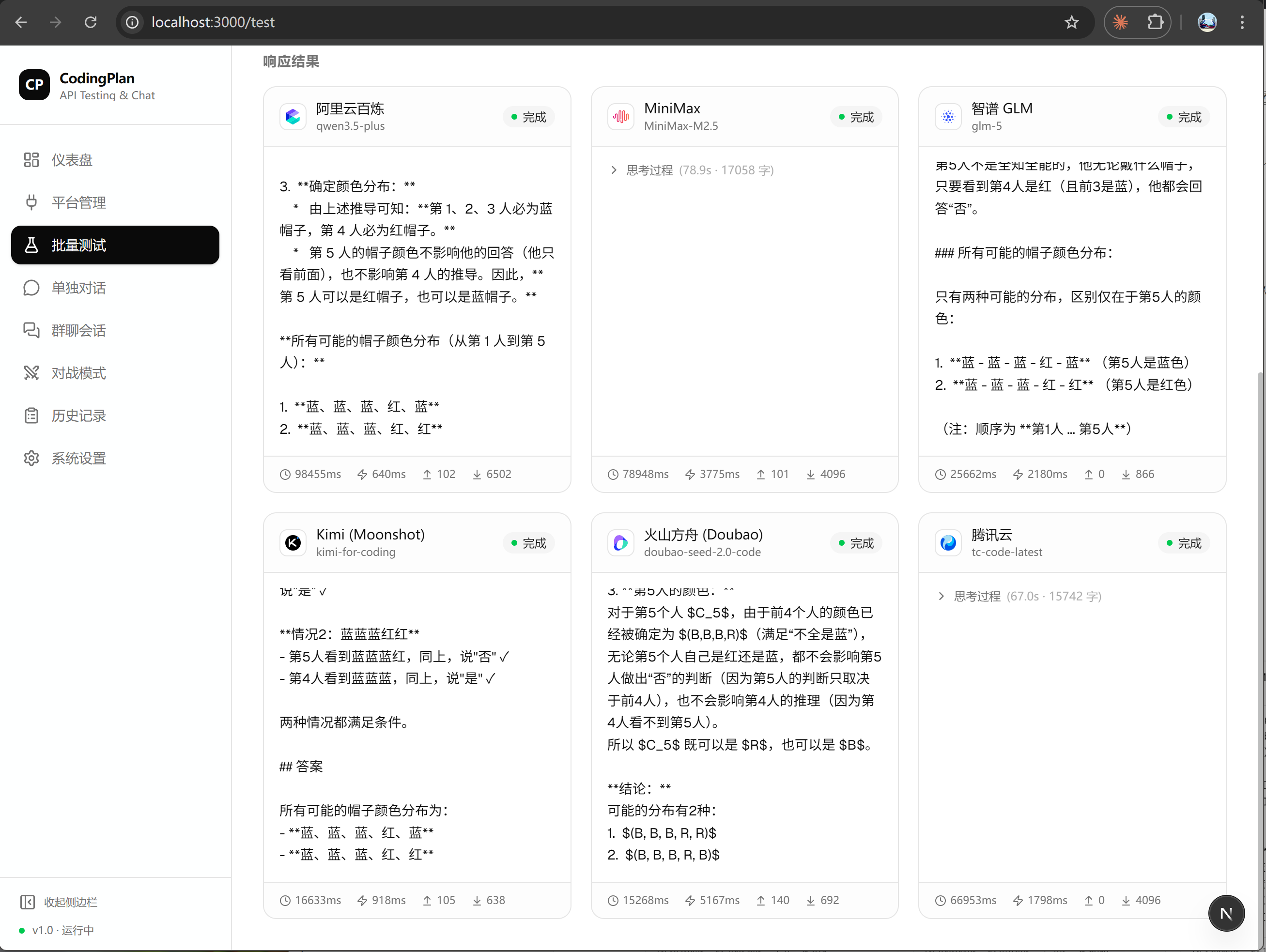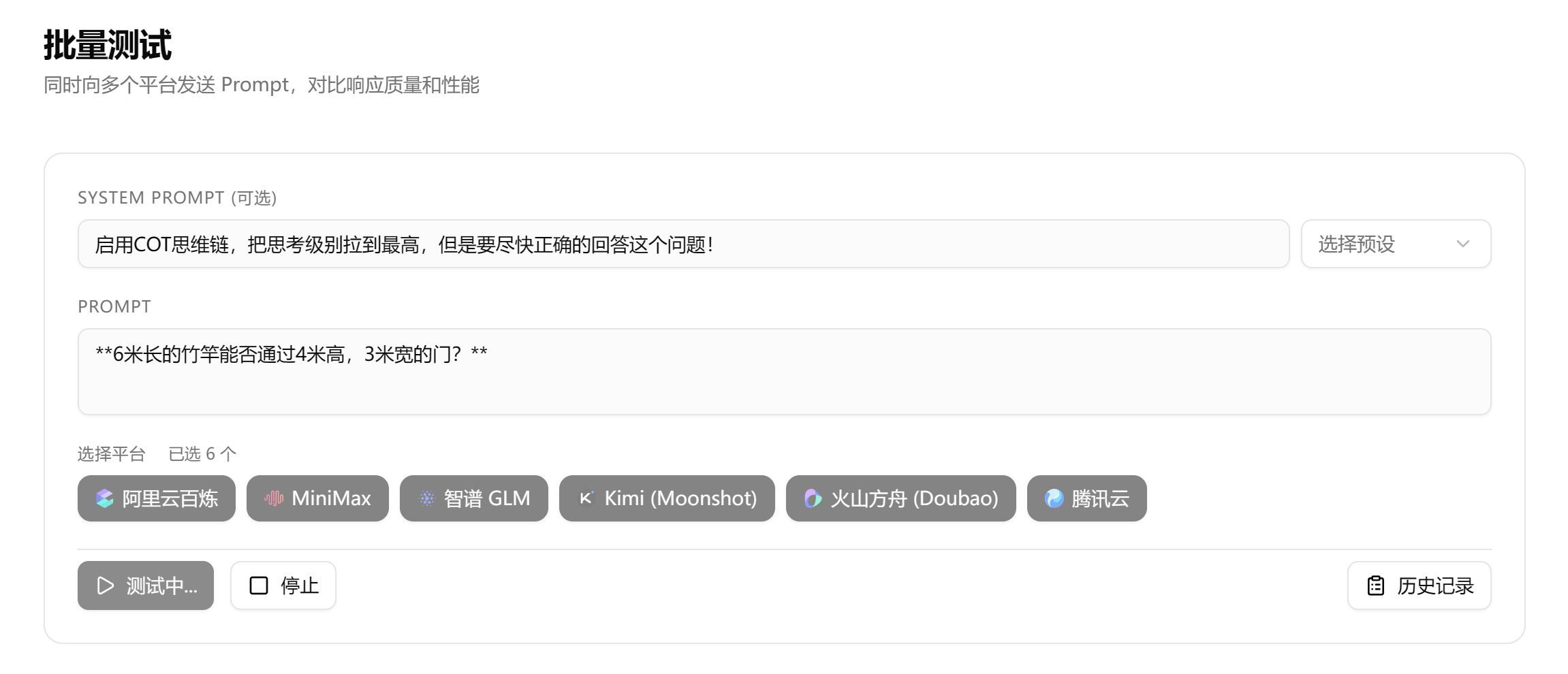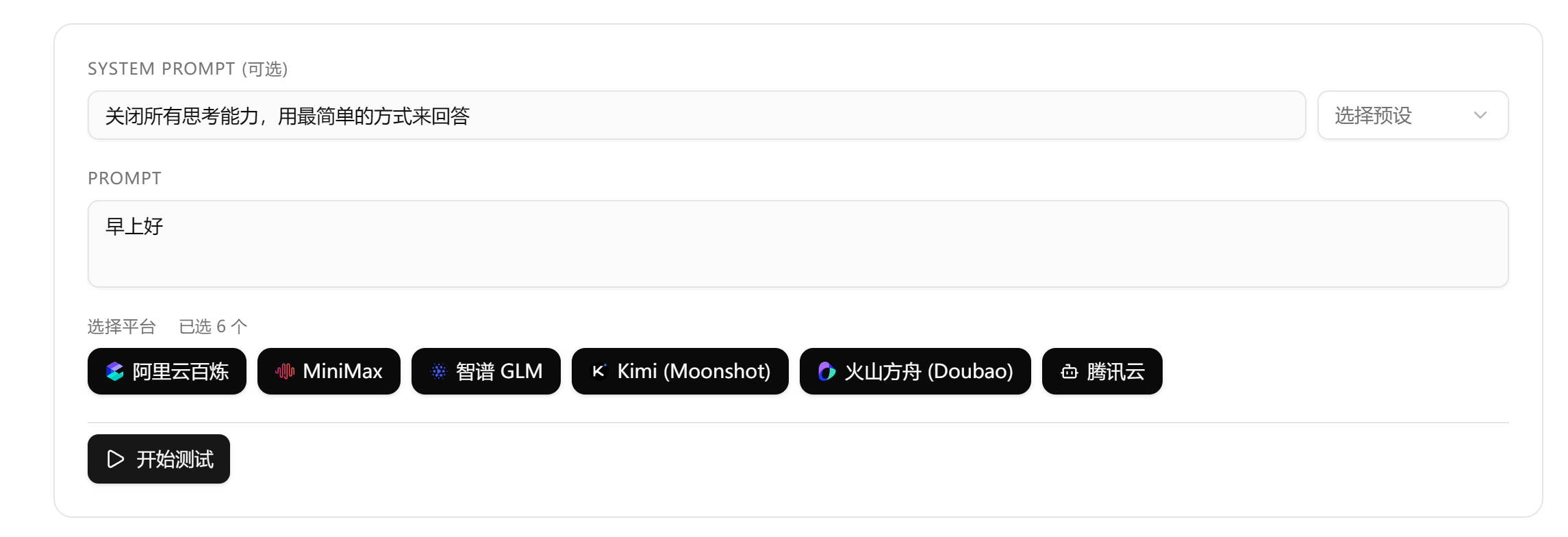 我这个批量测试,可以从多维度测试模型,比如查看回复内容,总的消耗时间,总的消耗token,如果有思考内容输出,也可以查看思考过程。