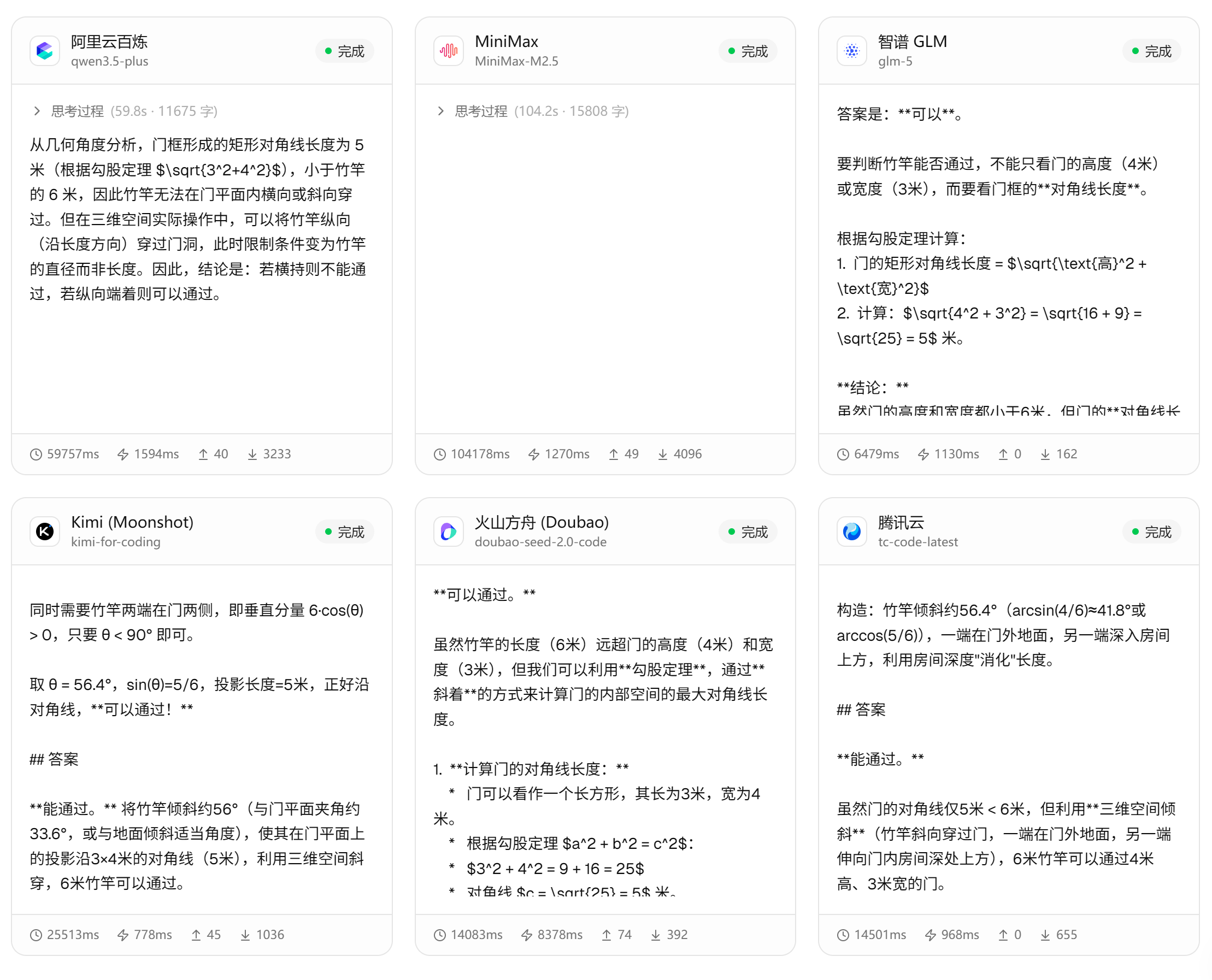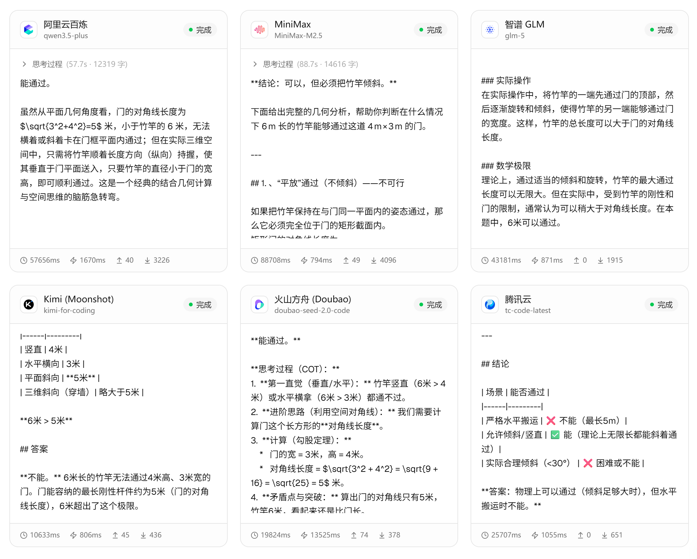 首先,我们可以看到MiniMax 和腾讯云交了白卷。就是思考卡住了,然后被截断了。