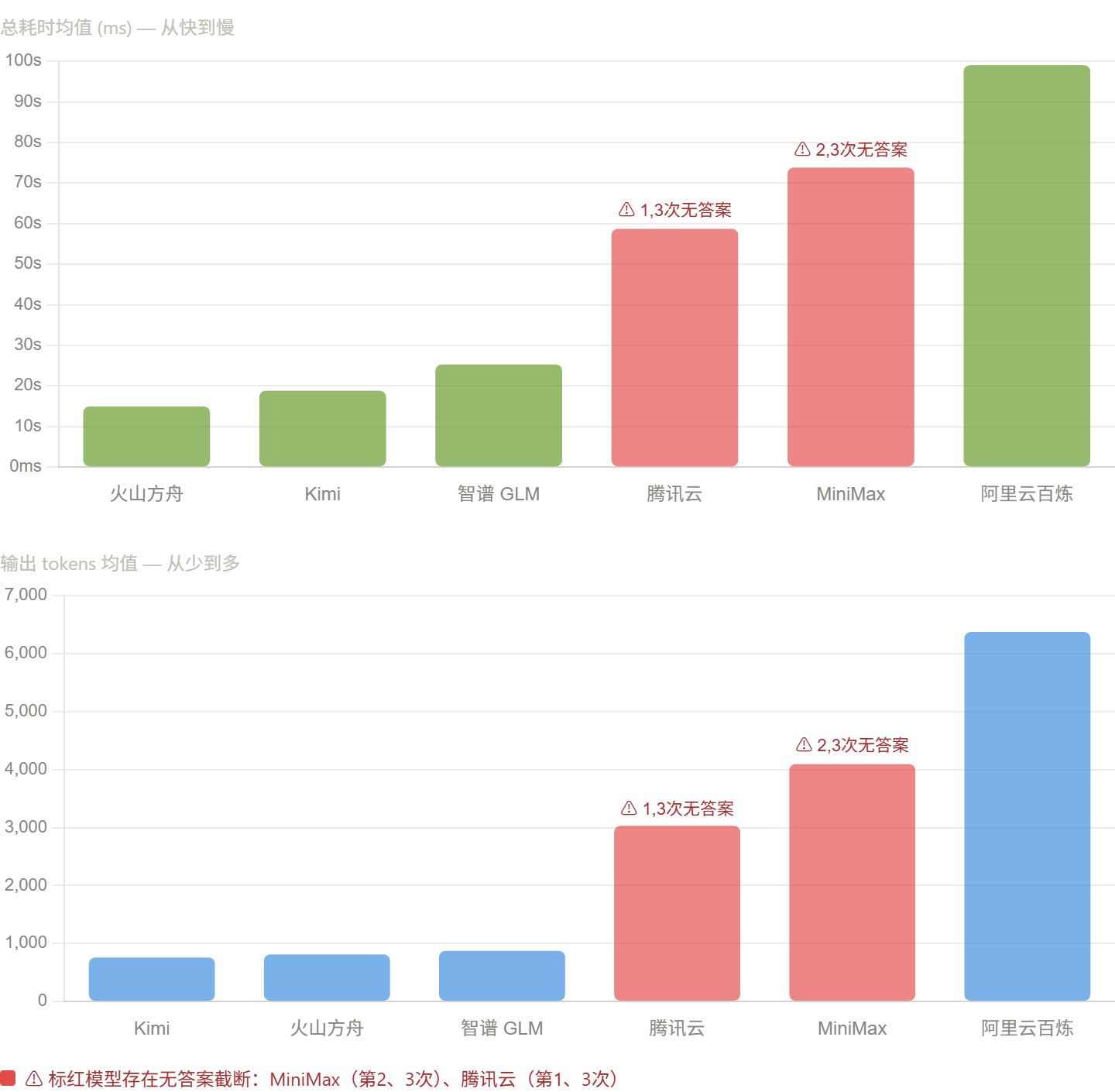 从这个图表来看,腾讯云,MiniMax,阿里云百炼可以先排除了,速度慢,token 消耗多。其中有两位选手,还常常答不出来。